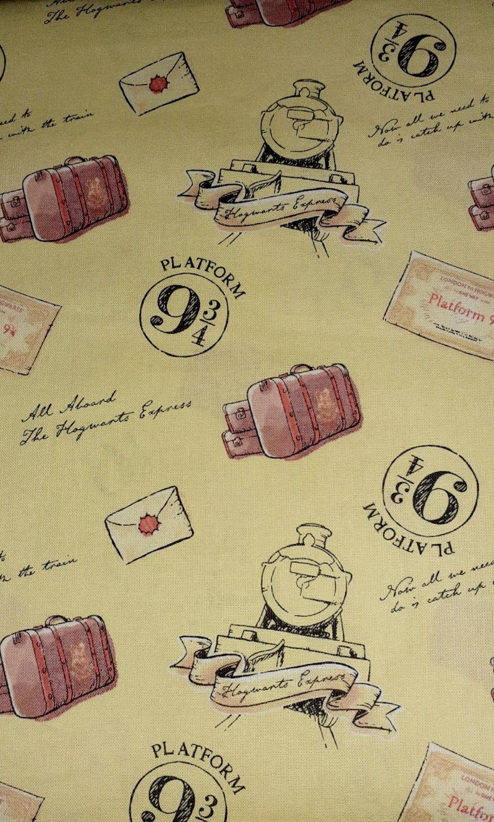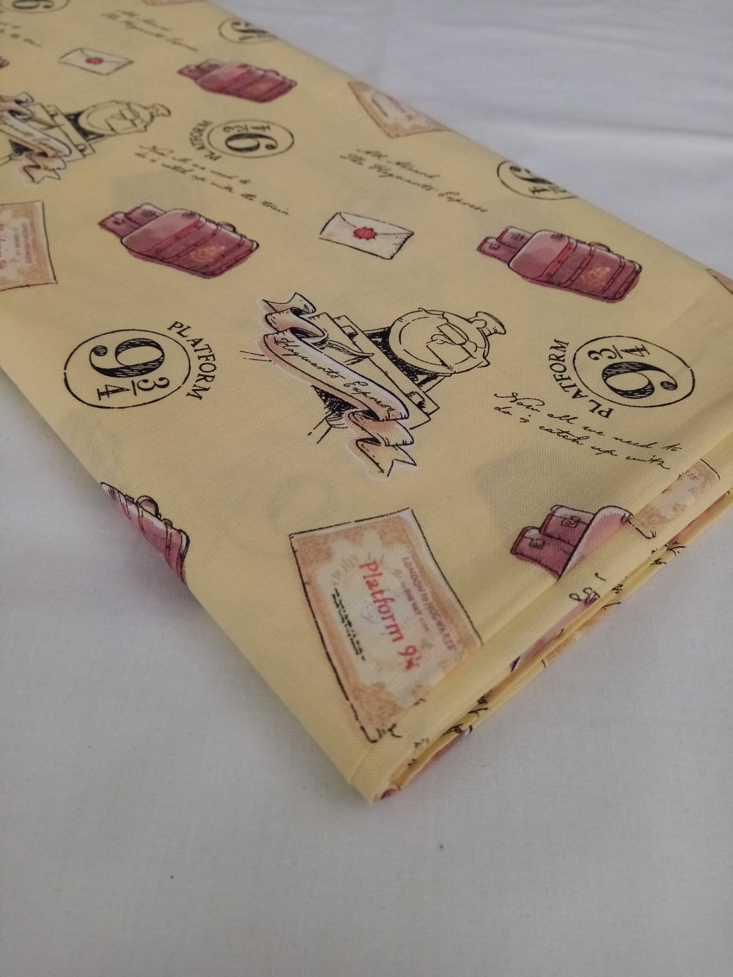Platform 9 3/4 0,14 € Partilhar Adicionar Contactar 50 unidades em stock Tecido 100% algodão, com motivos da saga Harry Potter em fundo amarelo 1.10m de largo Corte mínimo 20cm