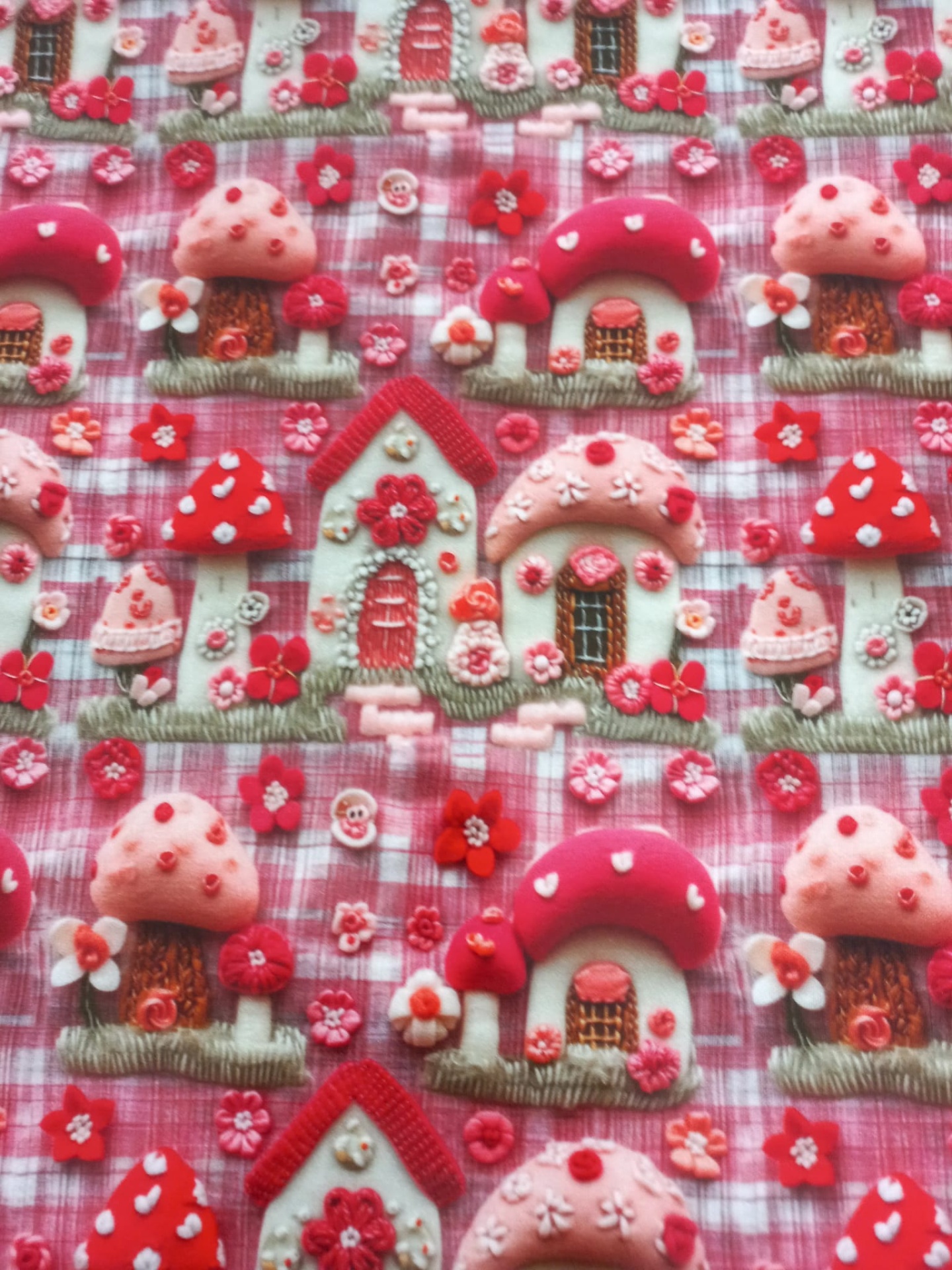 Tecido plastificado 3D com casinhas e cogumelos em tons de rosa e vermelho.