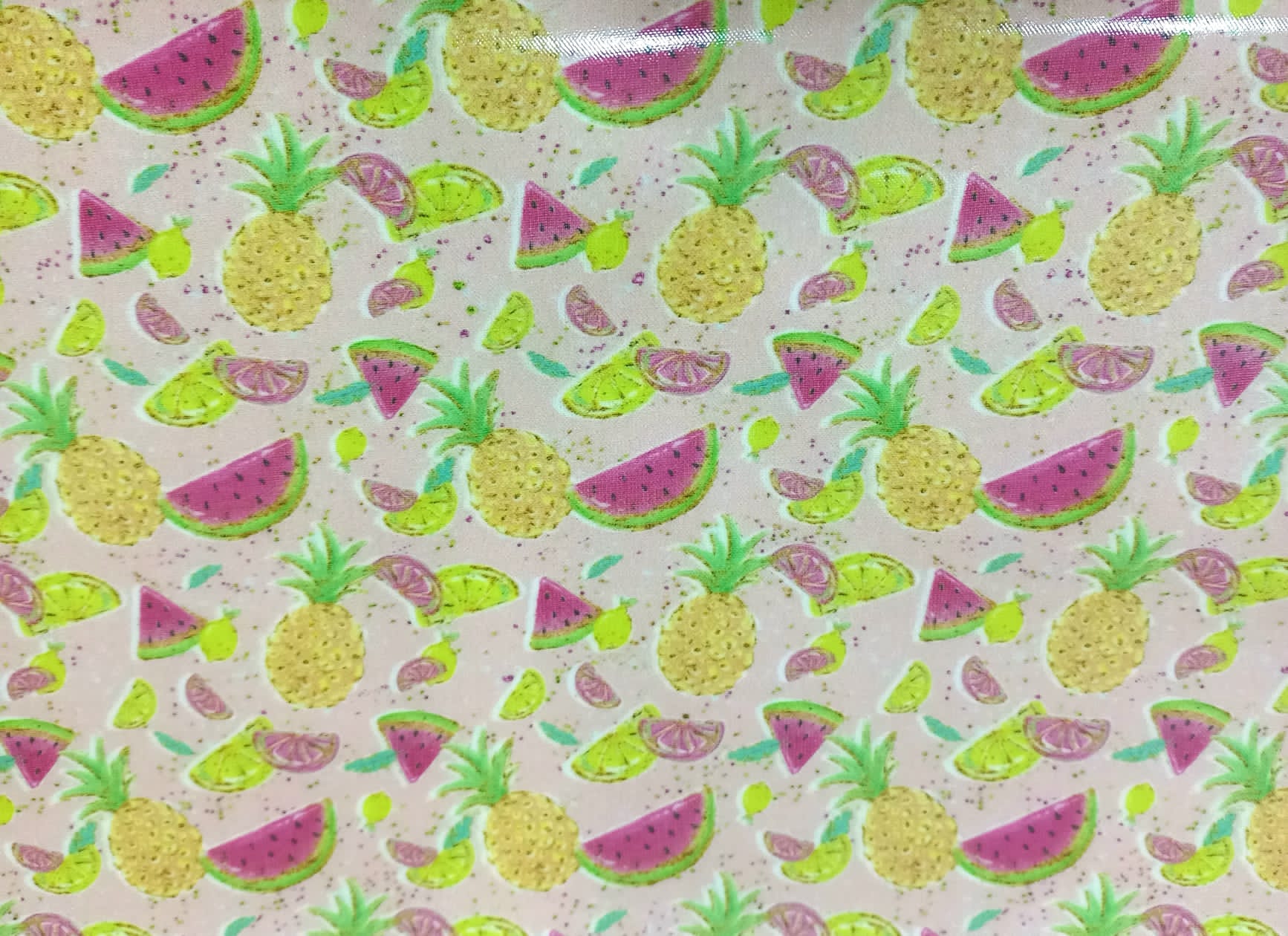 Tecido plastificado com fatias de melancia e de ananás em fundo rosa.
