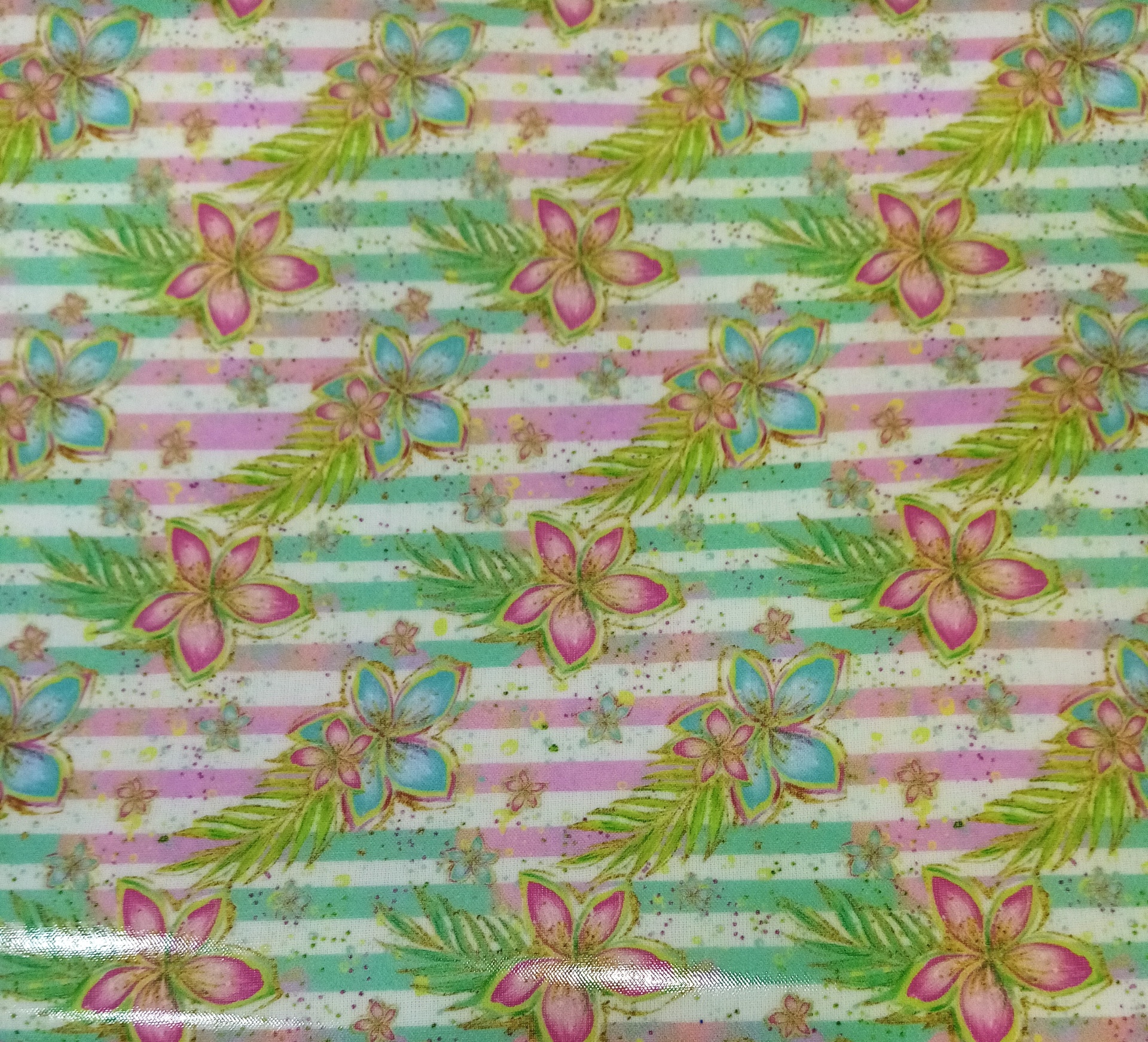 Tecido plastificado com flores em fundo listrado verde menta e rosa.
