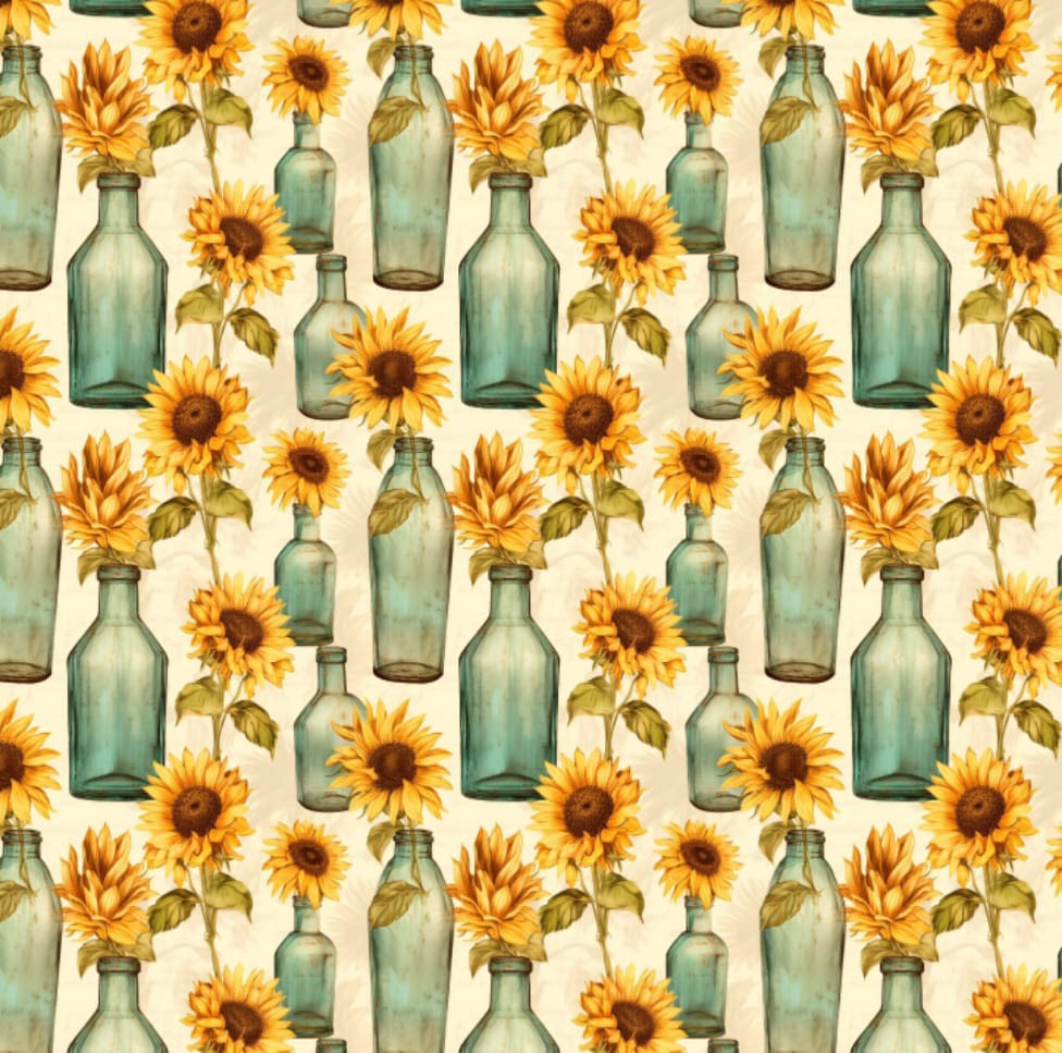 Tecido plastificado 3D com garrafas e girassóis em fundo pérola.