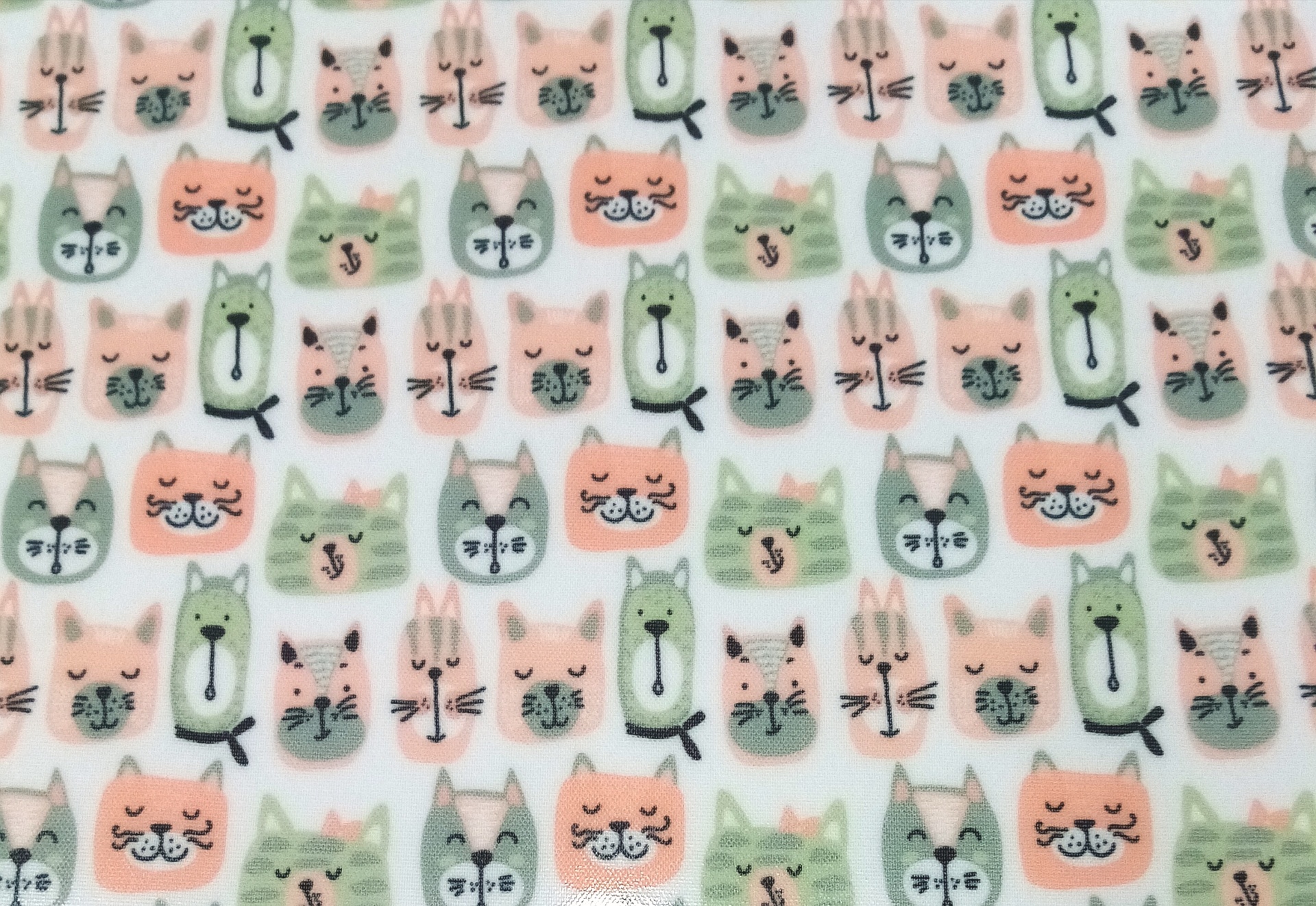 Tecido Plastificado com gatinhos coloridos em fundo branco.