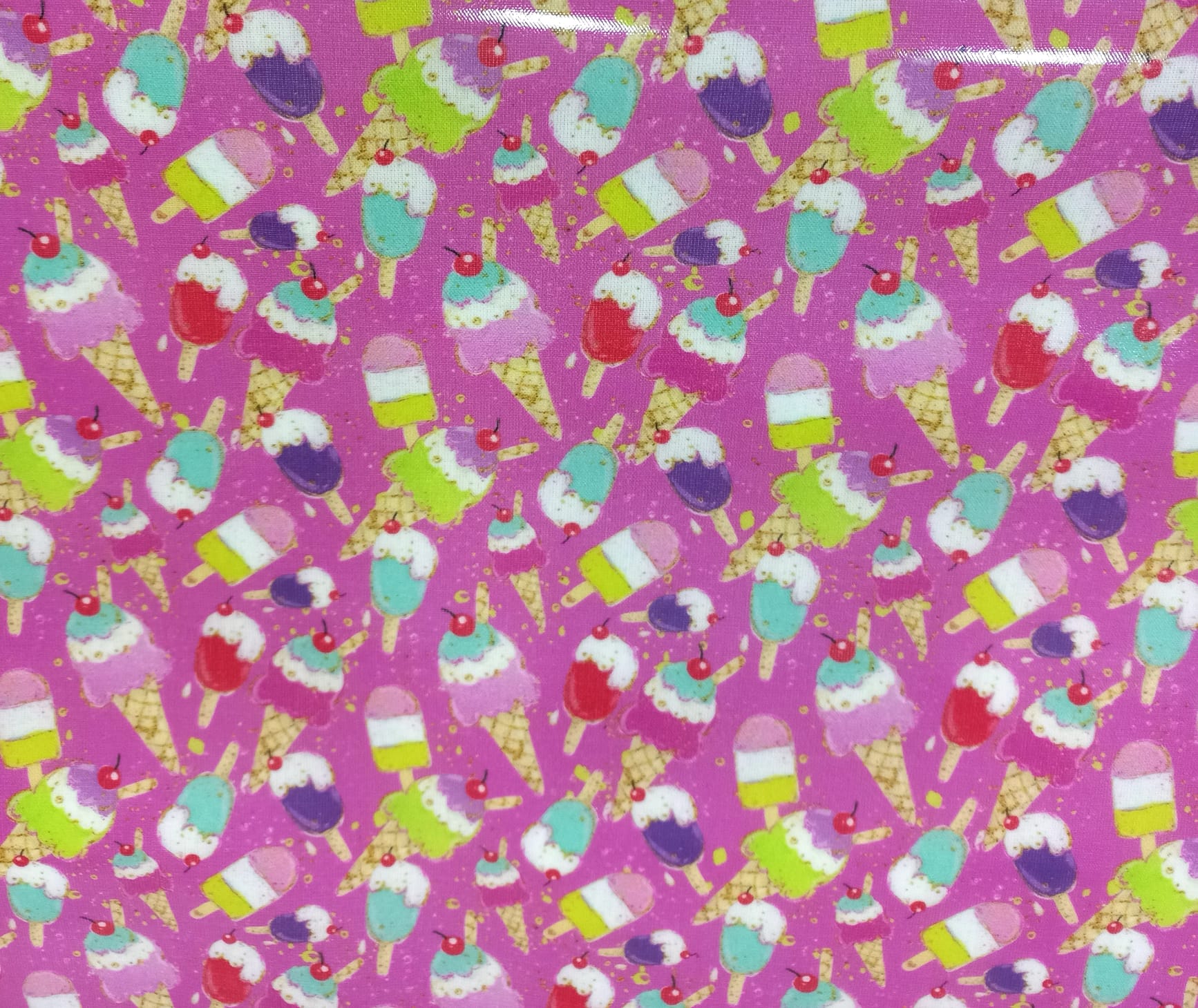 Tecido plastificado com gelados coloridos em fundo rosa fucsia.