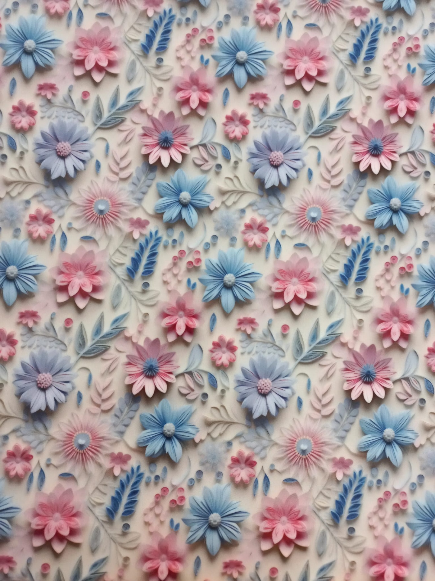 Tecido plastificado 3D com flores coloridas sobre fundo pérola.