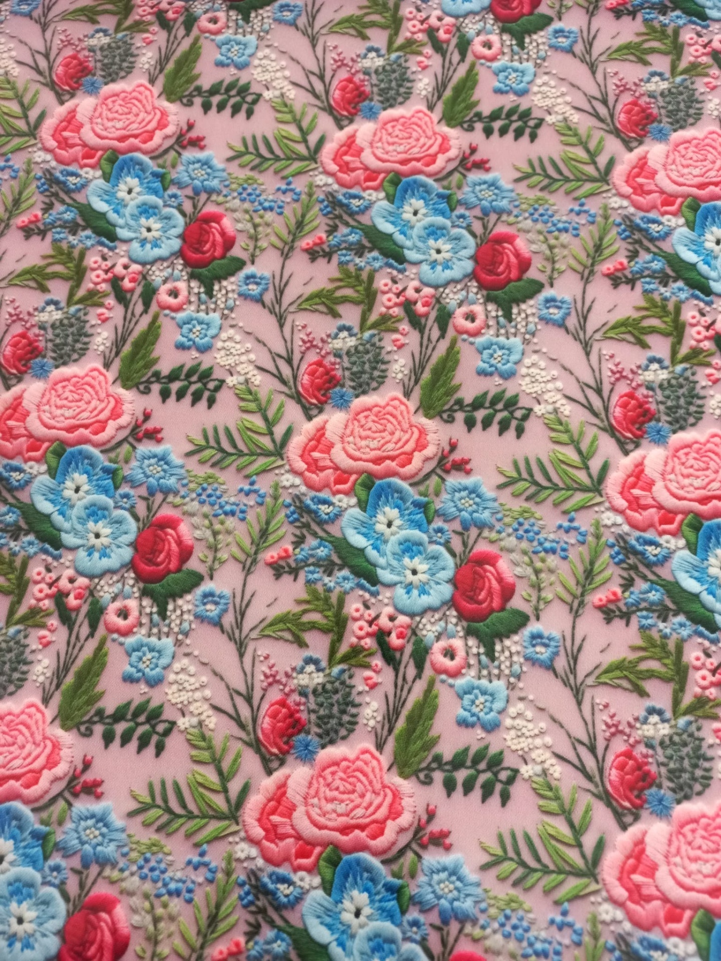Tecido plastificado 3D com motivos florais em fundo rosa velho.