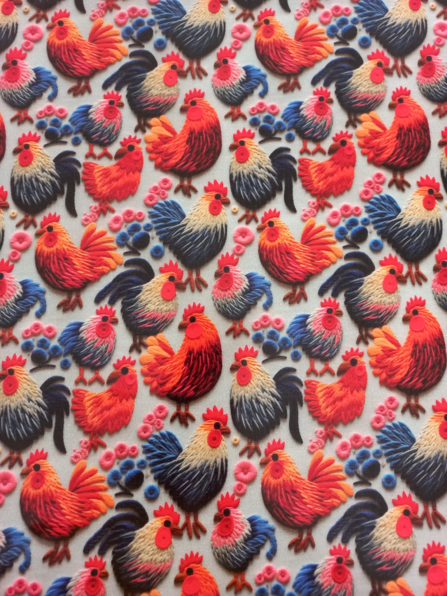 Tecido plastificado 3D com galos e galinhas em fundo cinza.