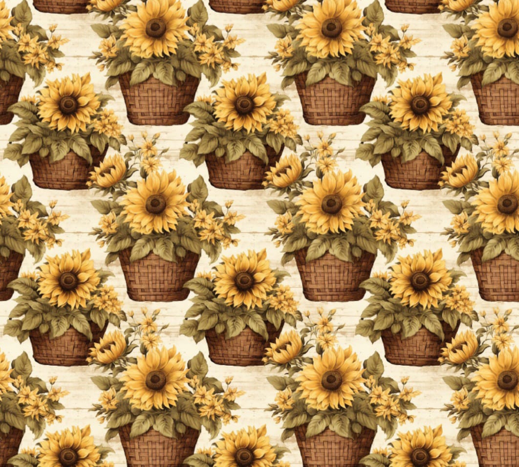 Tecido plastificado 3D com vasos de girassóis em fundo pérola.