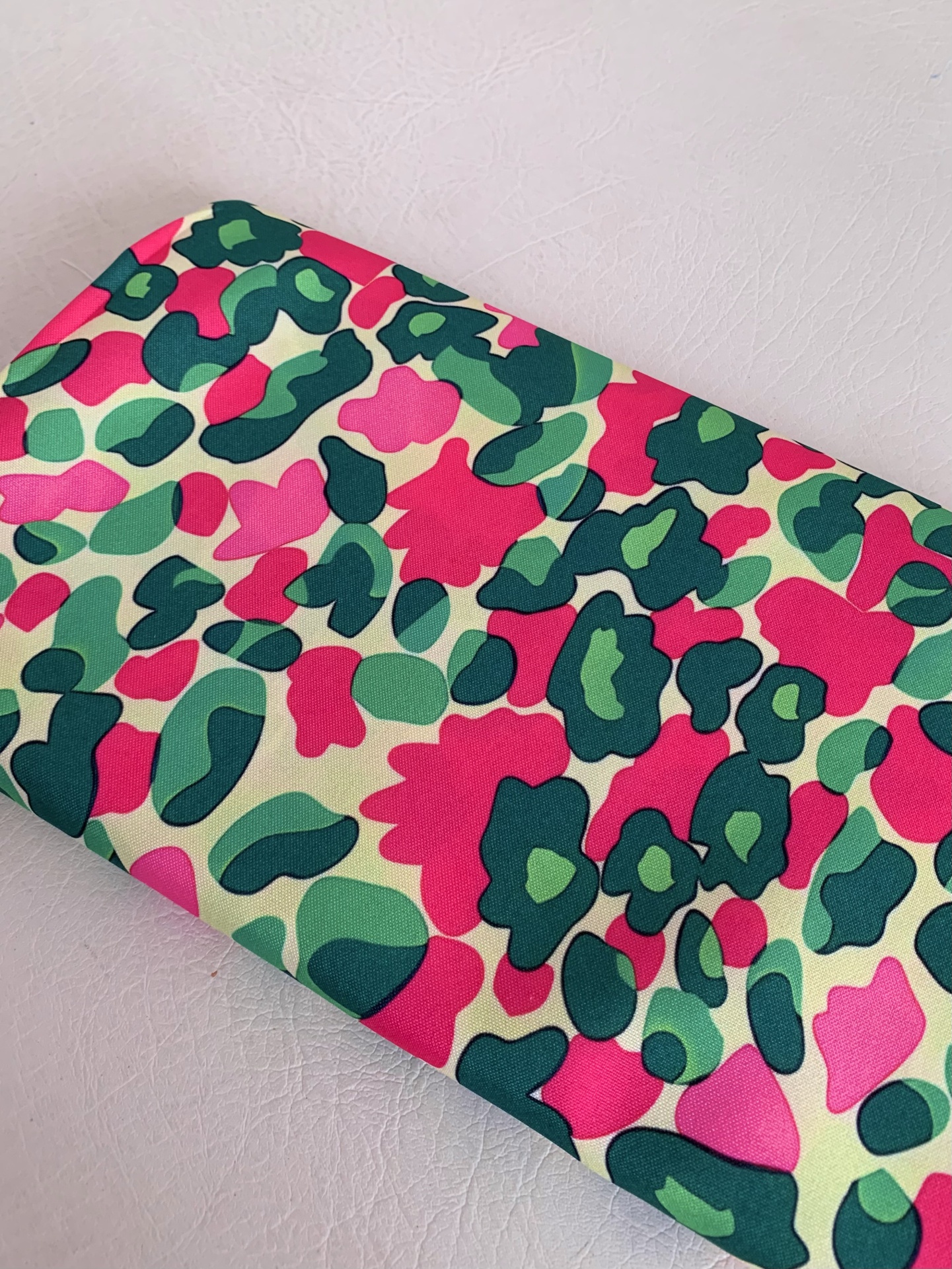 Policanva 100% poliéster, impermável em tons de verdes, rosa e rosa fucsia em fundo pérola
