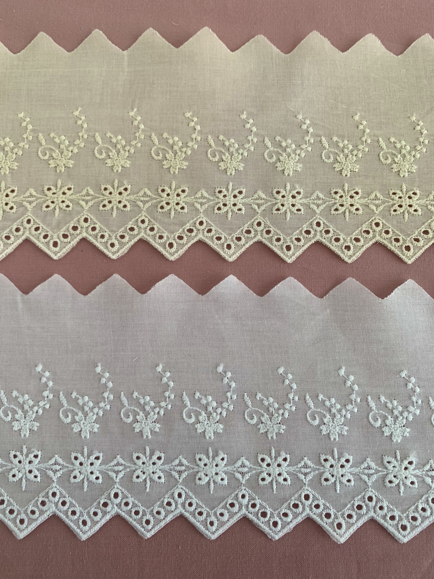 Ponta 100% Algodão em branco e bege com bicos e flores.