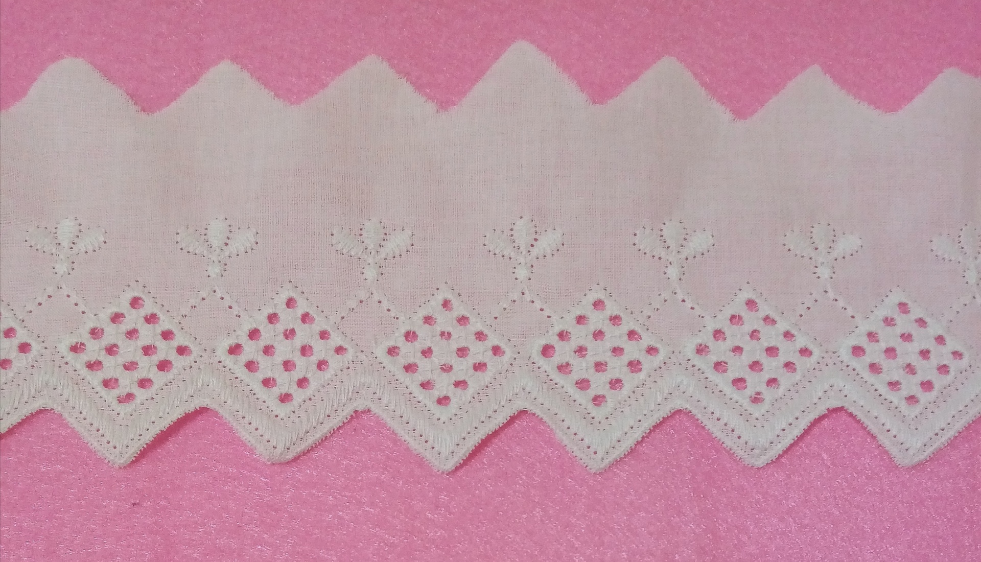 Ponta 100% Algodão em branco com flores e biquinhos.