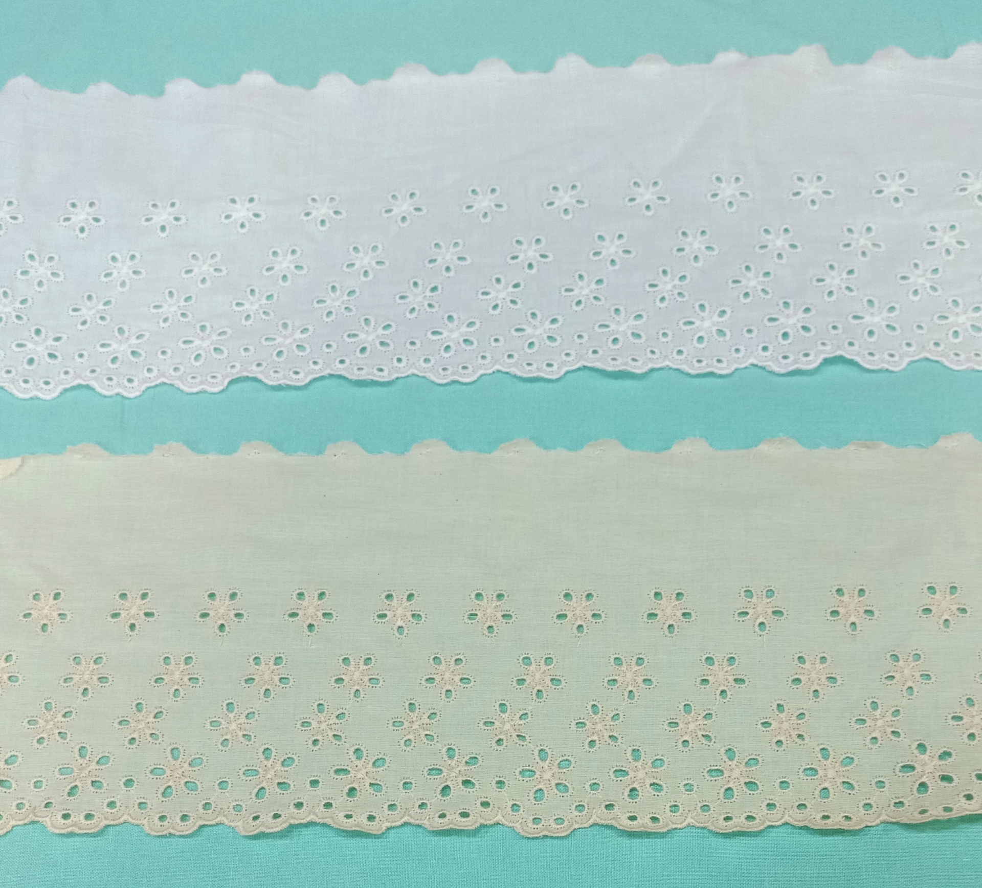 Ponta 100% Algodão em branco e bege com flores e bolas.