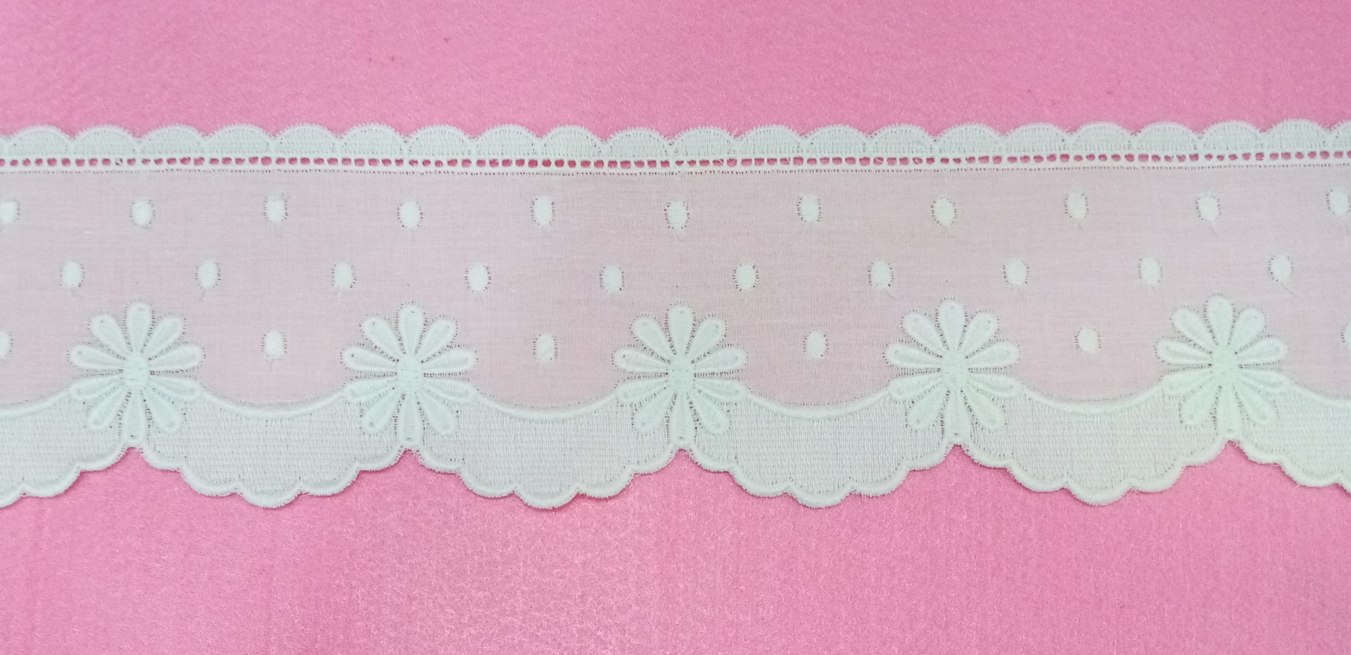 Ponta com malmequeres 42433 0,07 € Partilhar Adicionar Contactar Ponta 100% Algodão em branco com malmequeres. 75mm Ideal para pontas de bainha, decoração de toalhas, cortinados, panos de tabuleiro, decoração de vestuário de criança e adulto. Corte mínimo 20cm