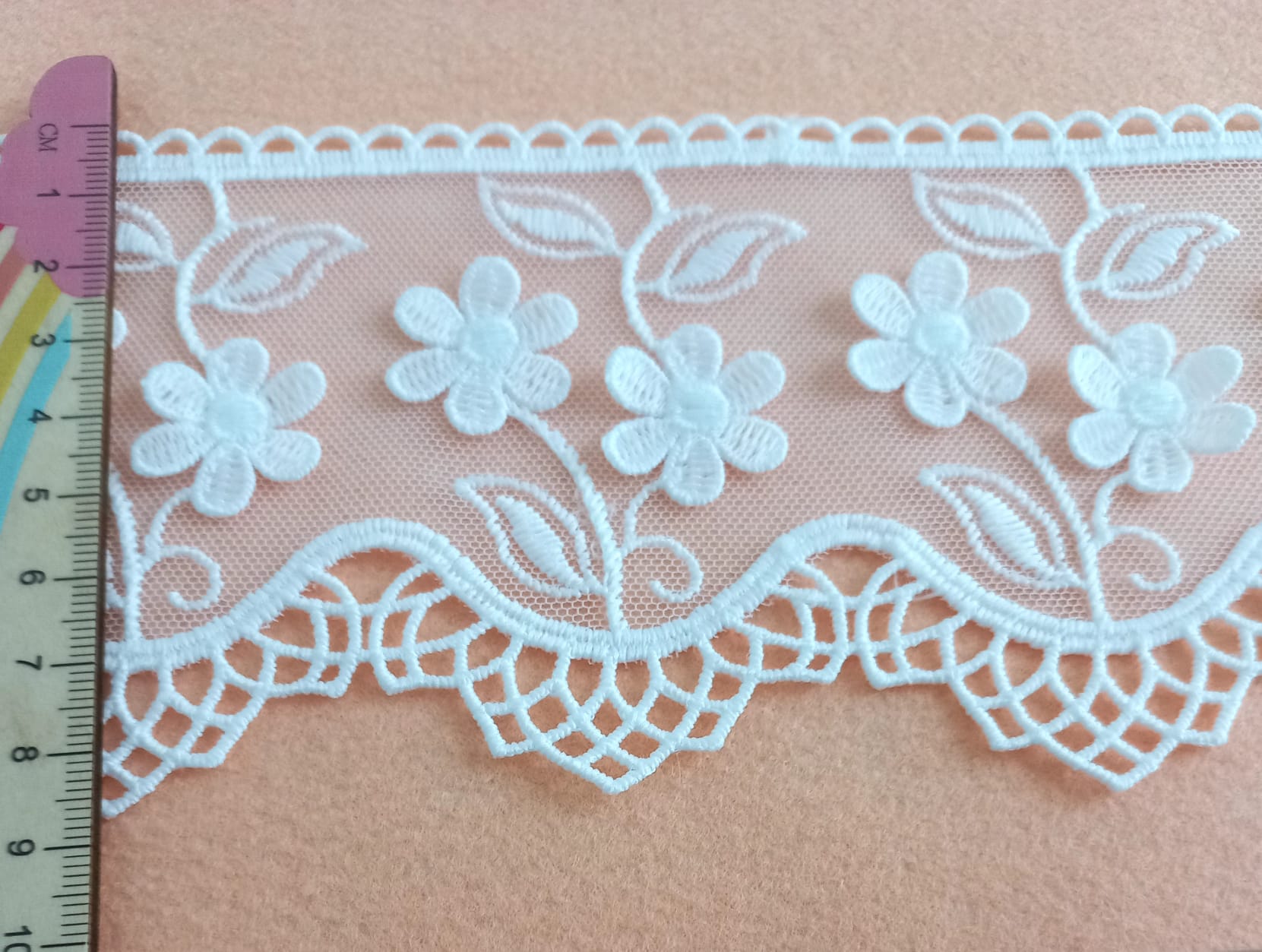 Ponta de renda 100% Poliéster em branco com biquinhos e flores.