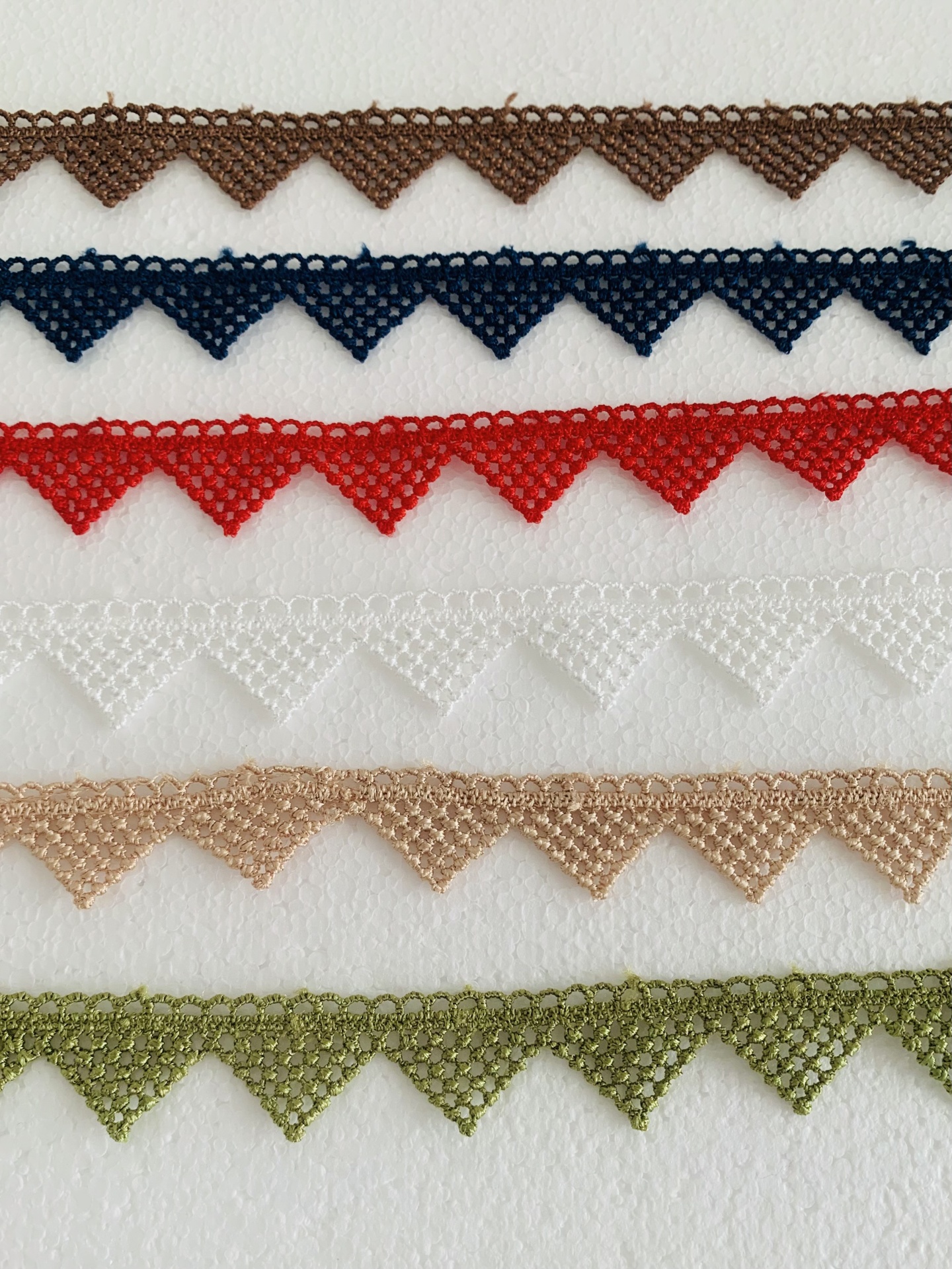 Ponta de Renda com Biquinhos 508748 0,02 € Partilhar Cor Castanho Azul Escuro Vermelho Branco Verde Creme Adicionar Contactar 1100 unidades em stock Ponta de Renda 100% poliéster em várias cores 22mm Ideal para pontas de bainha, decoração de toalhas, cortinados, panos de tabuleiro, decoração de vestuário de criança e adulto. Corte mínimo 20cm