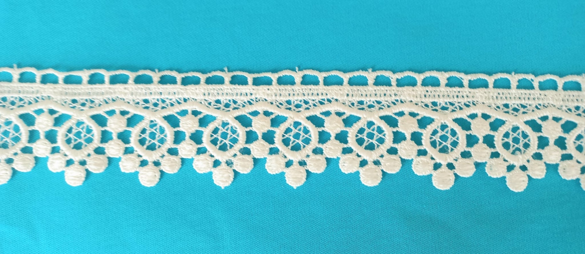 Ponta de Renda Guipure 100% poliéster em pérola com terminação em bolinhas.