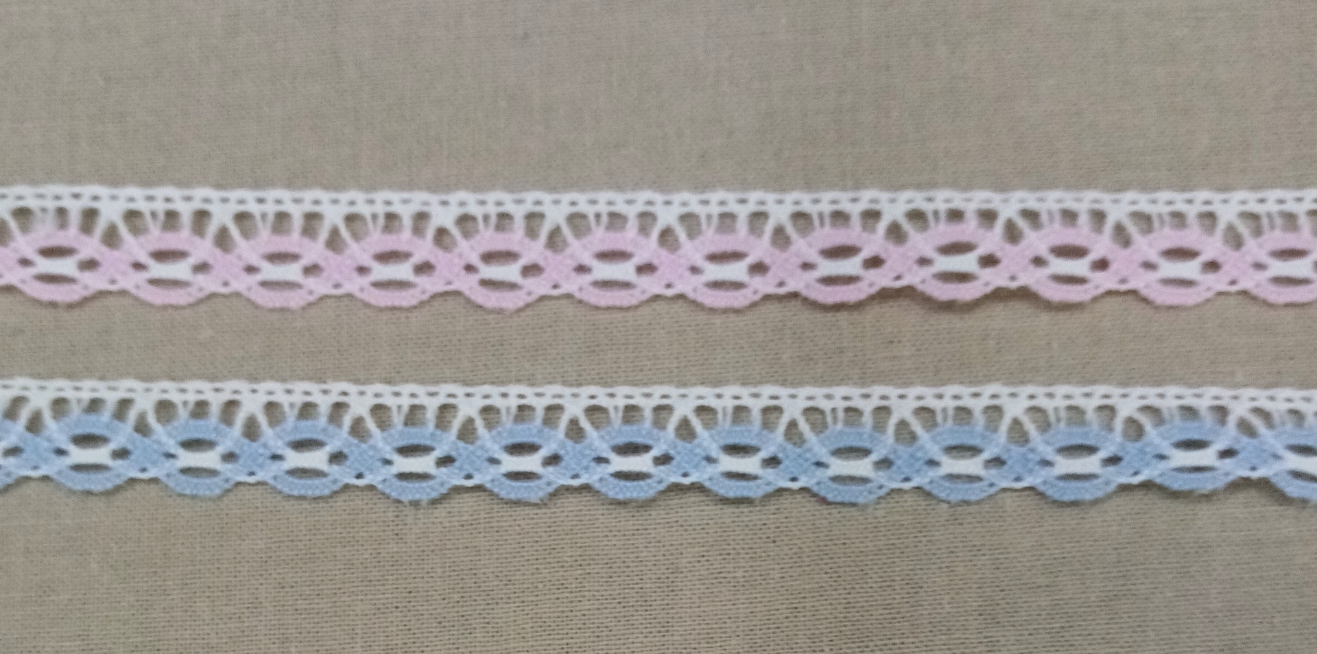Ponta de Renda R9604 0,01 € Partilhar Cor Branco e azul Branco e rosa Adicionar Contactar Ponta de Renda 100% algodão com ondinhas em branco e azul e branco e rosa 11mm Ideal para pontas de bainha, decoração de toalhas, cortinados, panos de tabuleiro, decoração de vestuário de criança e adulto. Corte mínimo 20cm