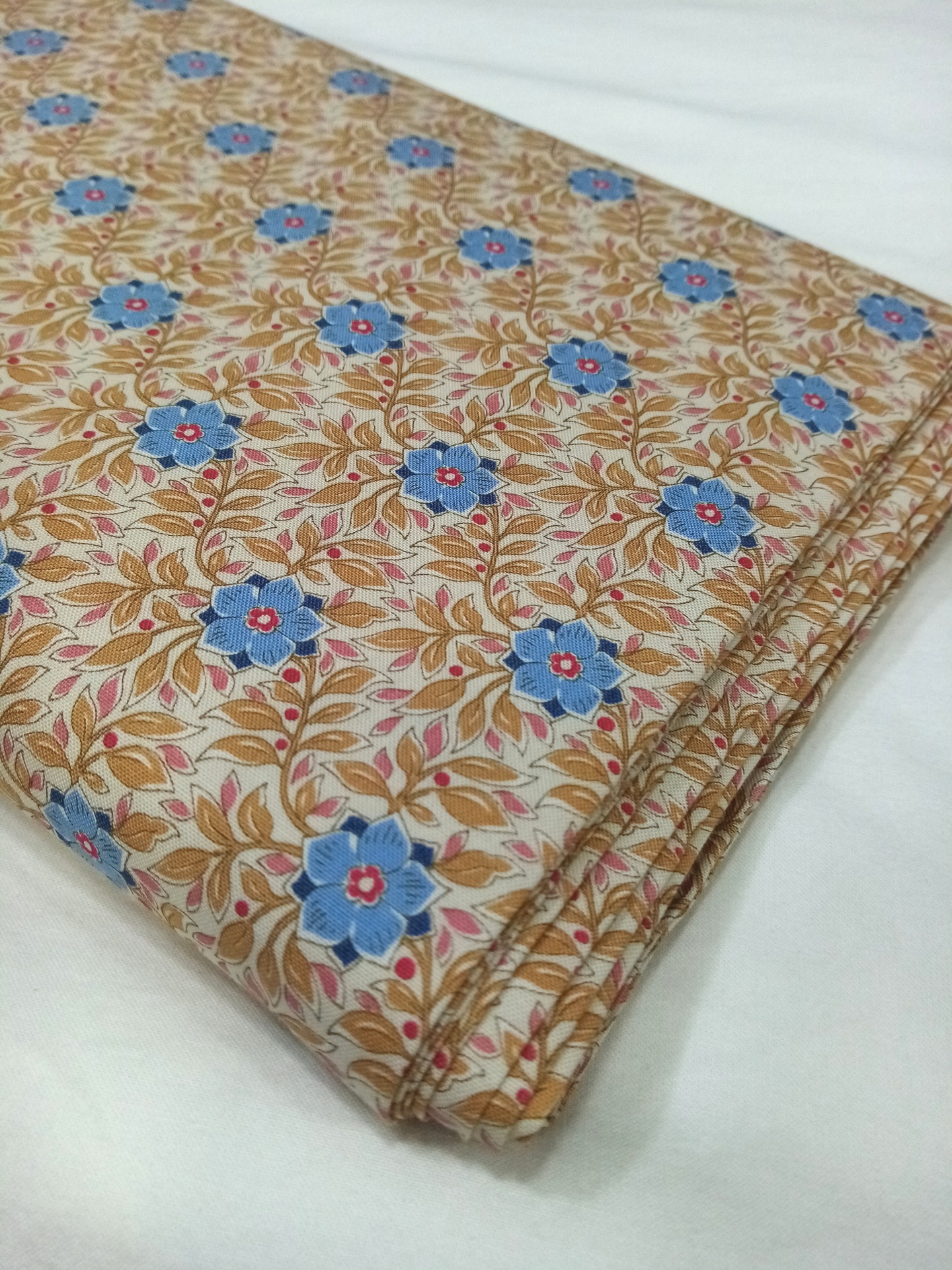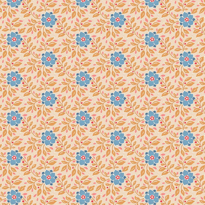 Tecido Tilda 100% algodão, com flores azuis e folhas camel em fundo creme.