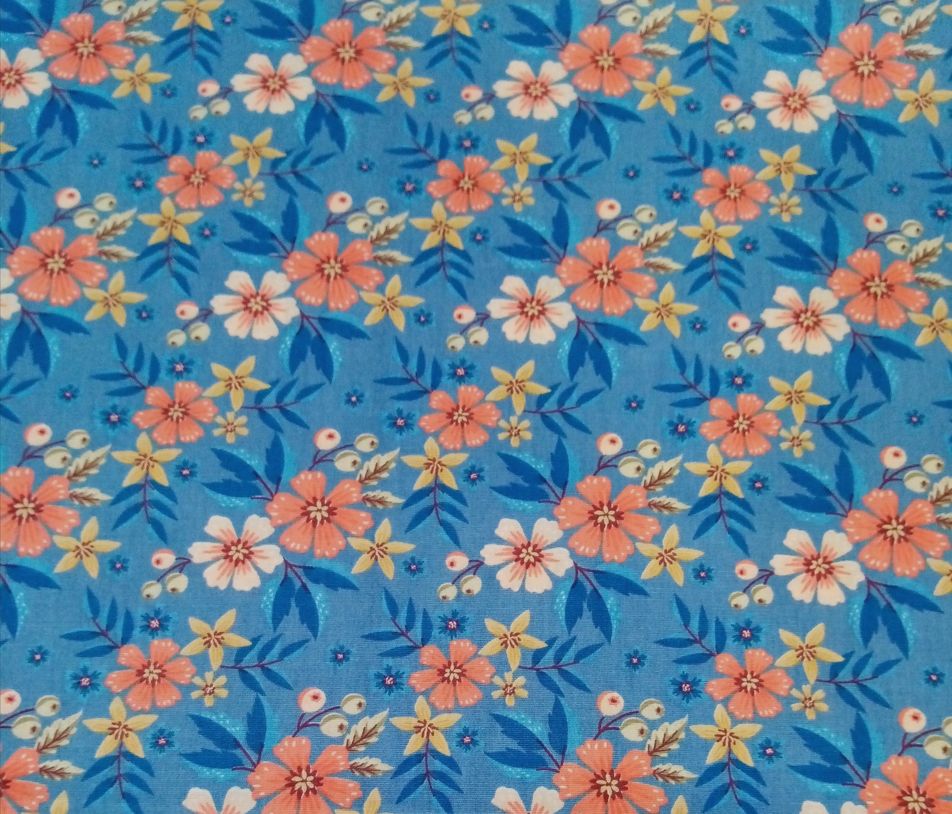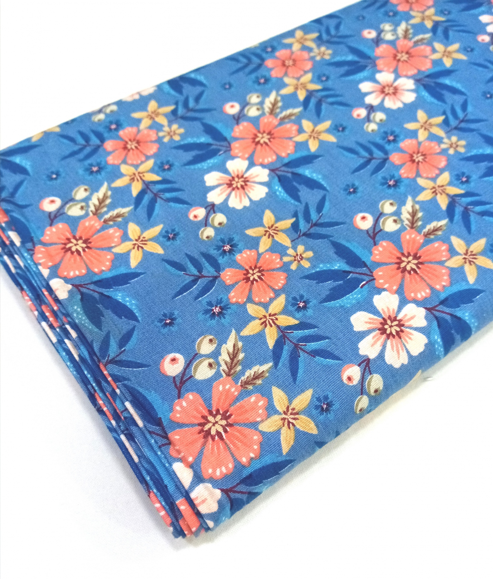 Tricoline Fabricart 100% algodão com flores salmão em fundo azul.