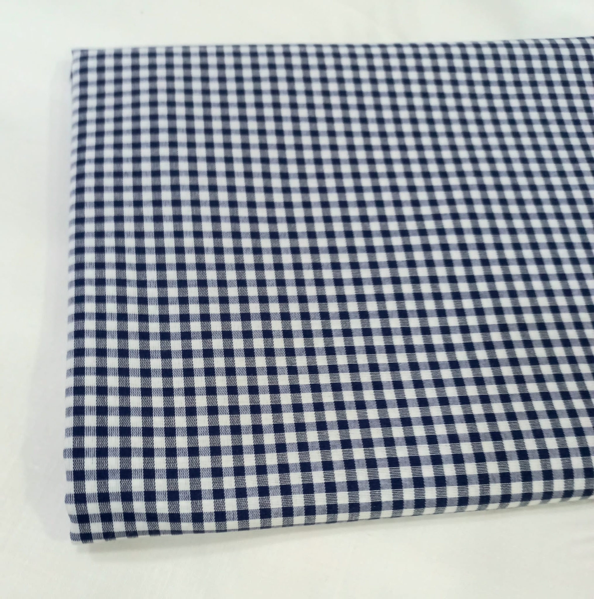 Tecido 60% algodão, 40% poliester com quadradinhos azuis escuros e branco.