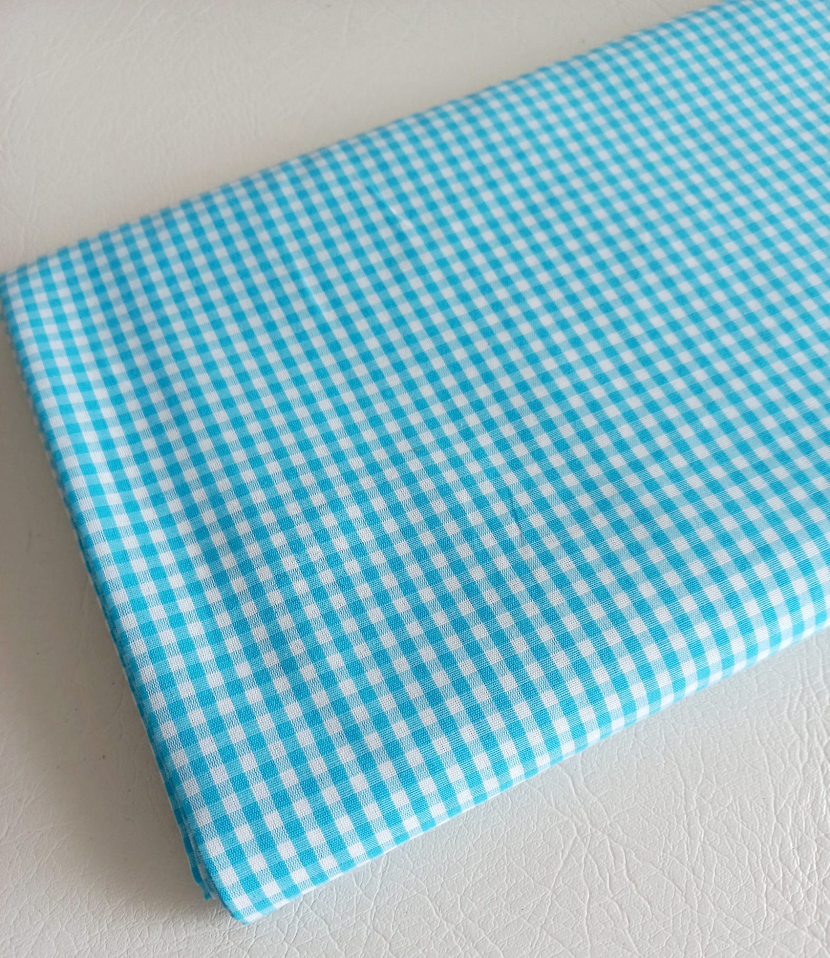 Tecido 60% algodão, 40% poliester com quadradinhos azul turquesa e branco.