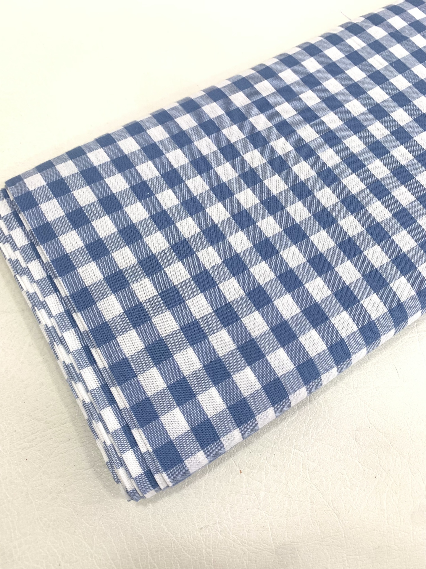 Popeline 100% Algodão , com quadrados médios em azul ganga e branco.