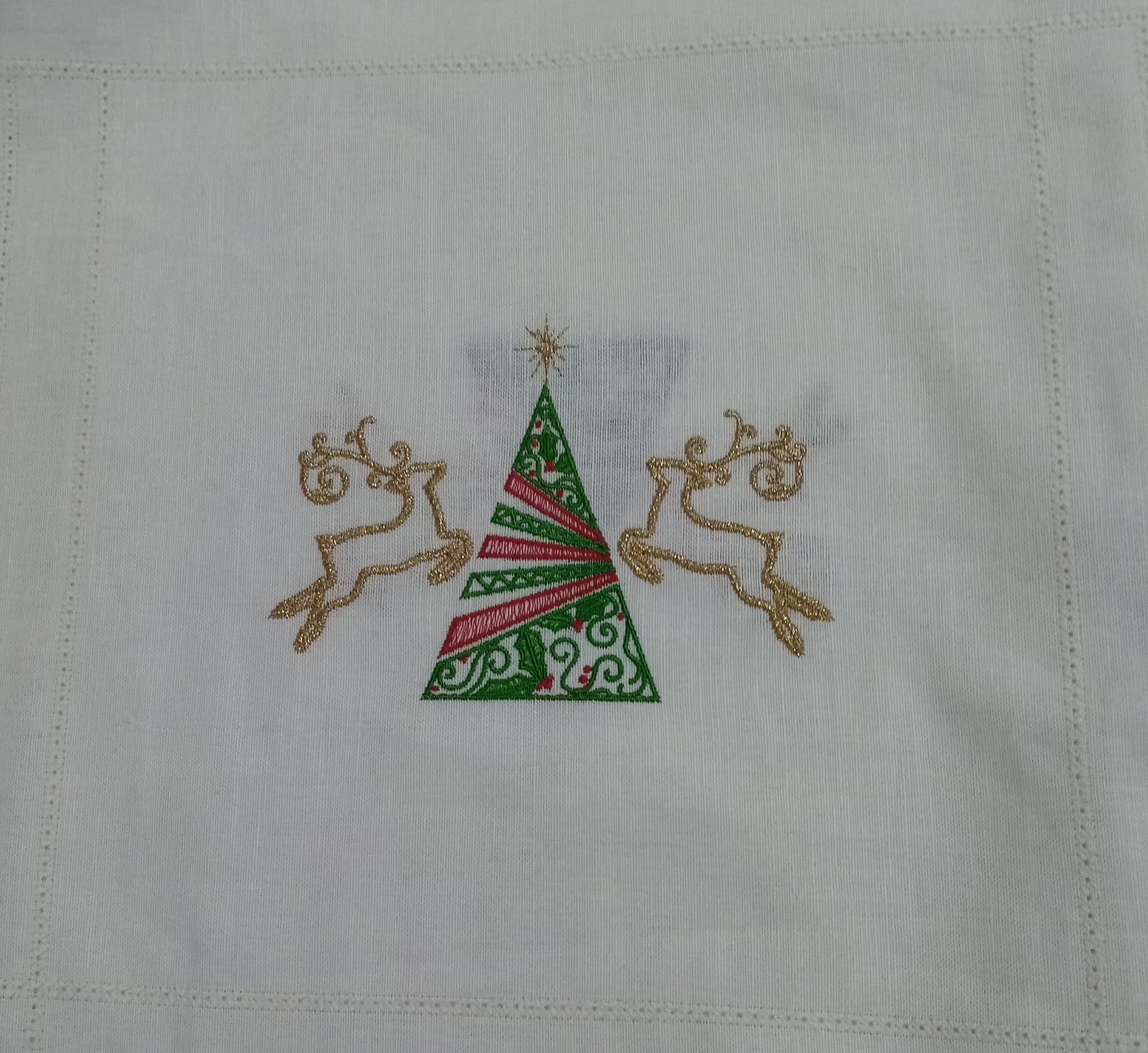 Quadrados 100% Linho com renas e árvores de natal.