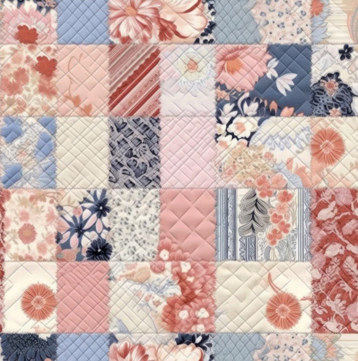 Tricoline 100% algodão, com quadrados estampados em tons de azul, rosa e salmão.