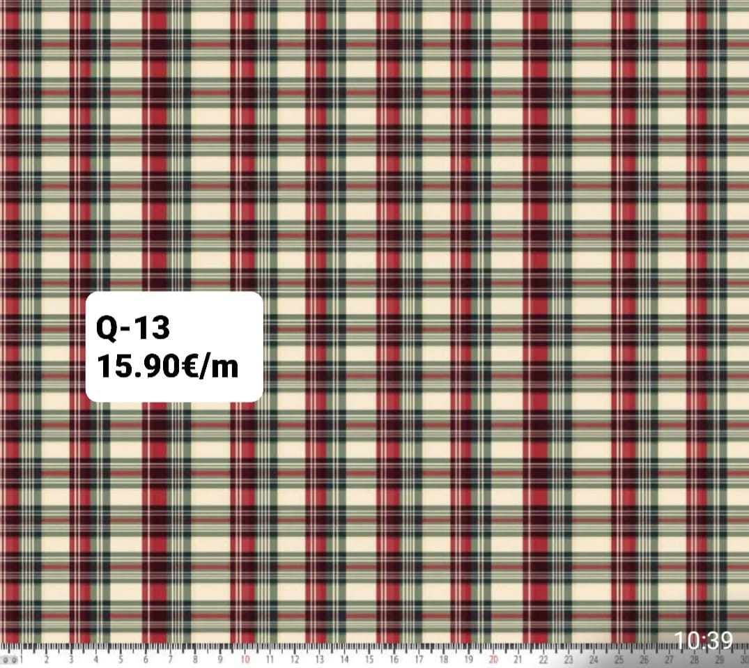 Tecido 100% algodão com quadrados bege, vermelho e verde.