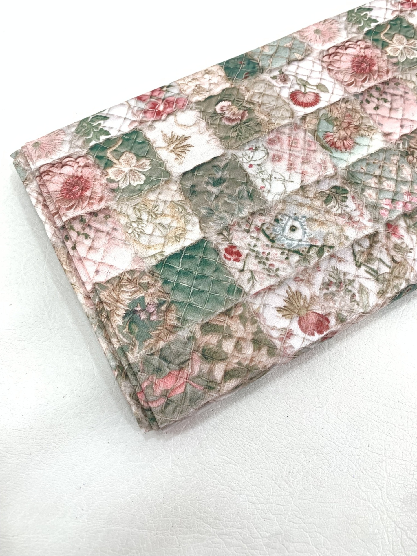 Tricoline 100% algodão, com quadrados em tons de verde, rosa e pérola.
