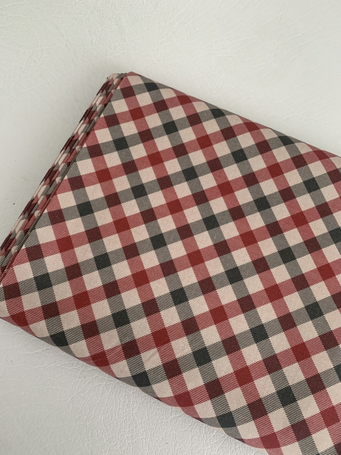 Tricoline 100% algodão com quadrados em tons de bege, verde seco e cereja.