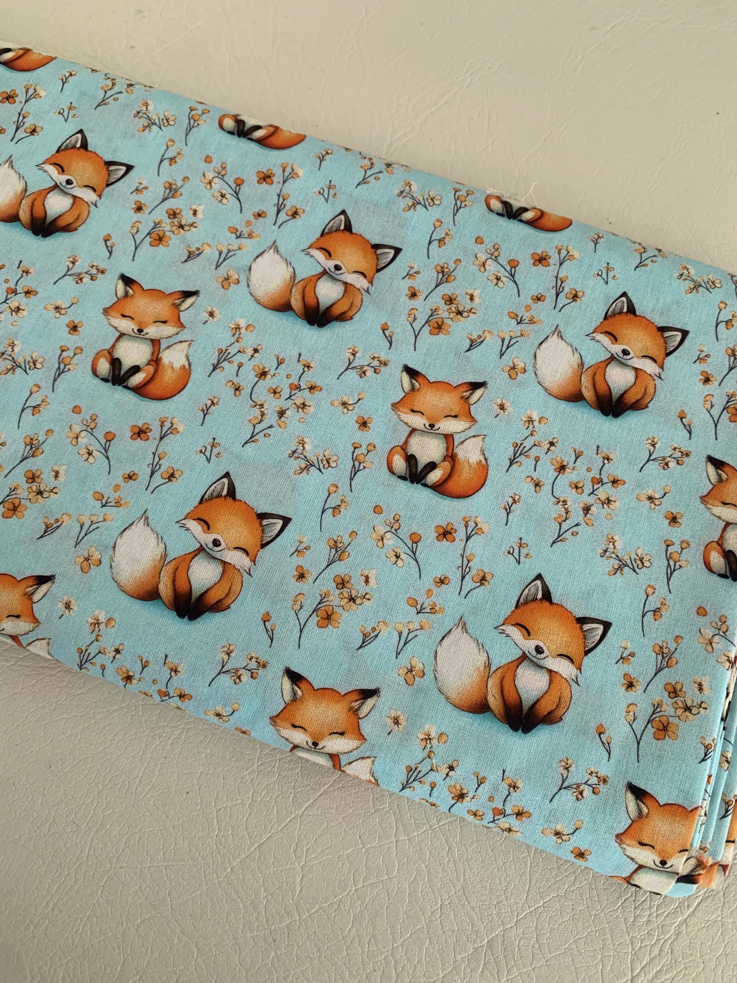 Tecido 100% Algodão , com raposas em fundo verde menta.