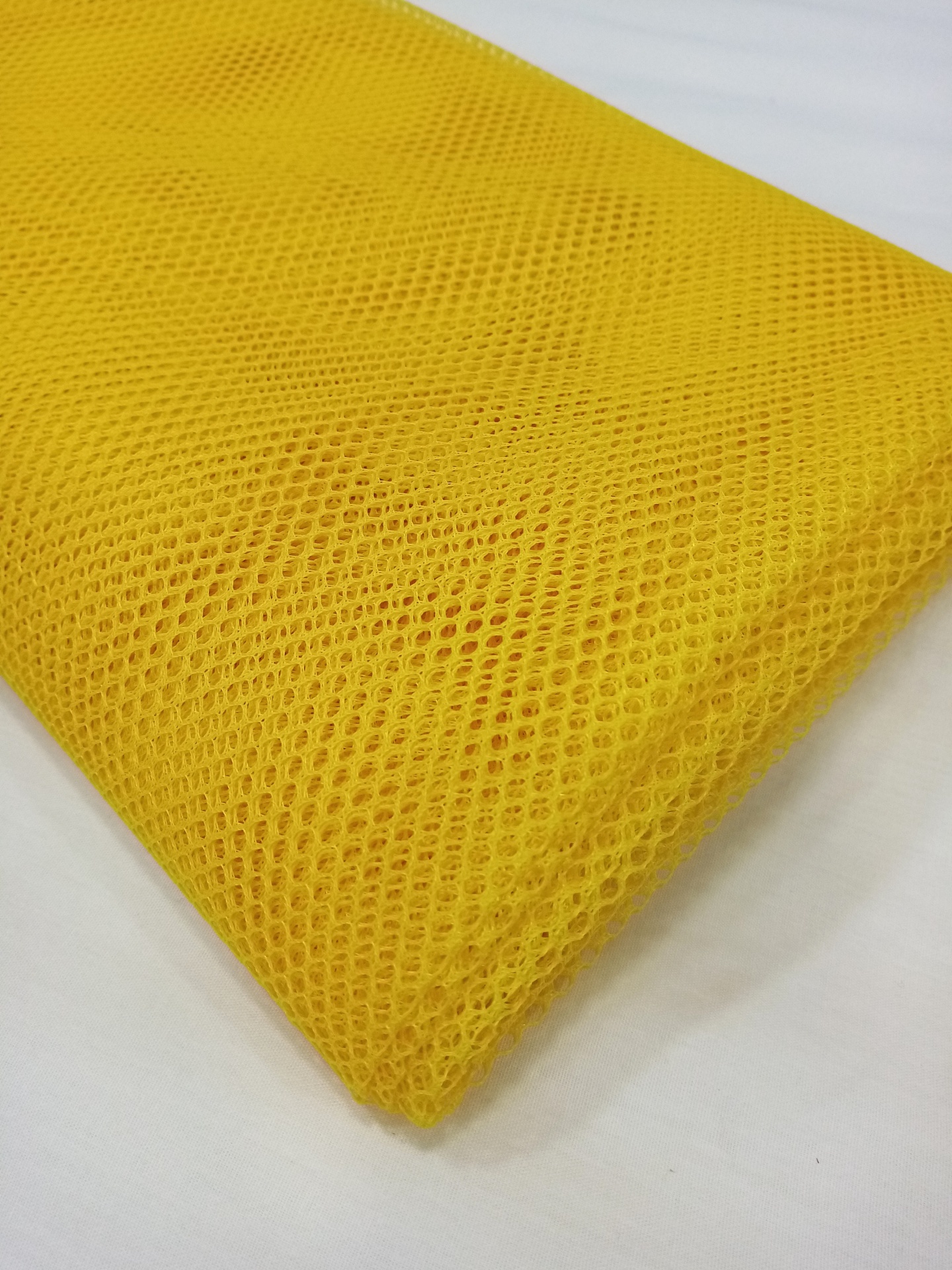Rede Mesh 100% poliéster em amarelo, própria para fazer bolsos em malas, carteiras ou mochilas, também indicado para vestuário desportivo, sacos de fruta ou legumes.