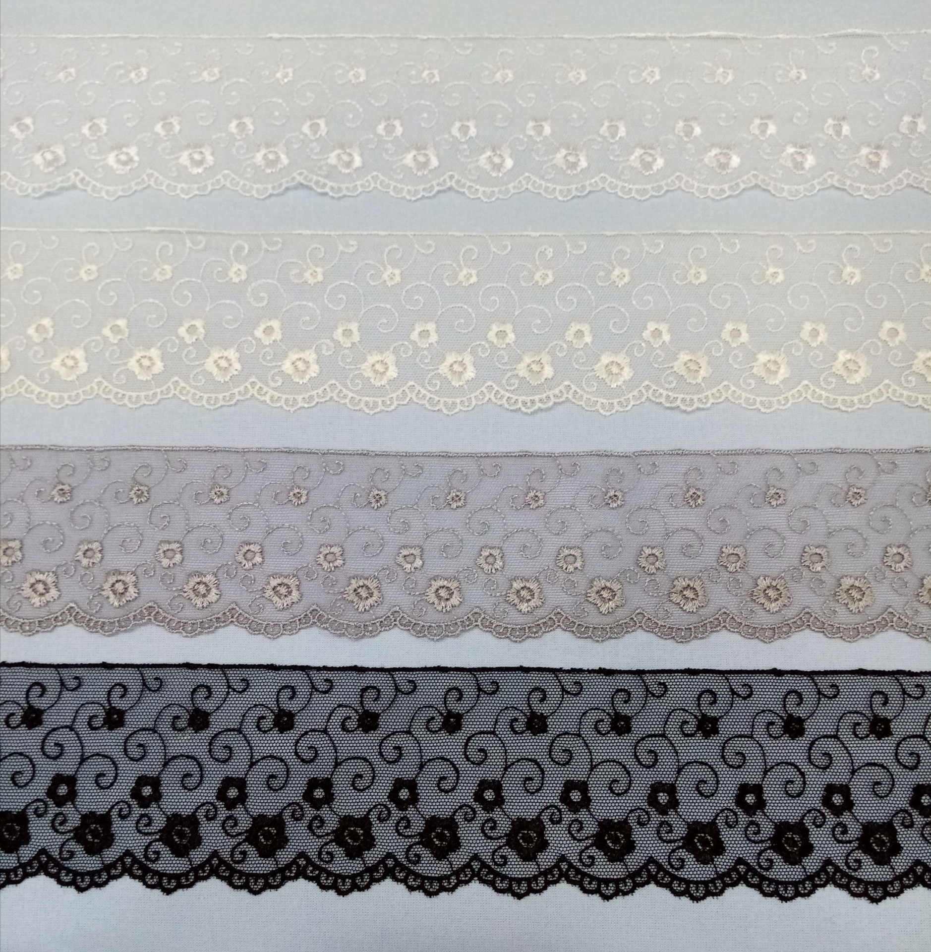 Renda em tule com flores 0,02 € Partilhar Cor Branco Pérola Cinza Preto Adicionar Contactar 85 unidades em stock Ponta de renda em tule com flores. 72mm Corte mínimo 20cm