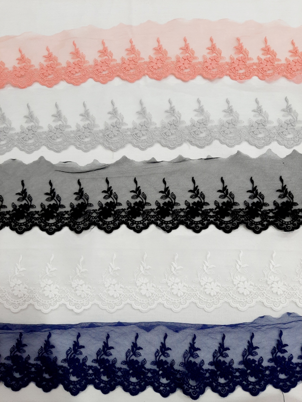 Renda em tule com ramos e flores 0,03 € Partilhar Cor Branco Preto Azul escuro Cinza Salmão Adicionar Contactar Renda larga em tule com ramos e flores 95mm Corte mínimo 20cm