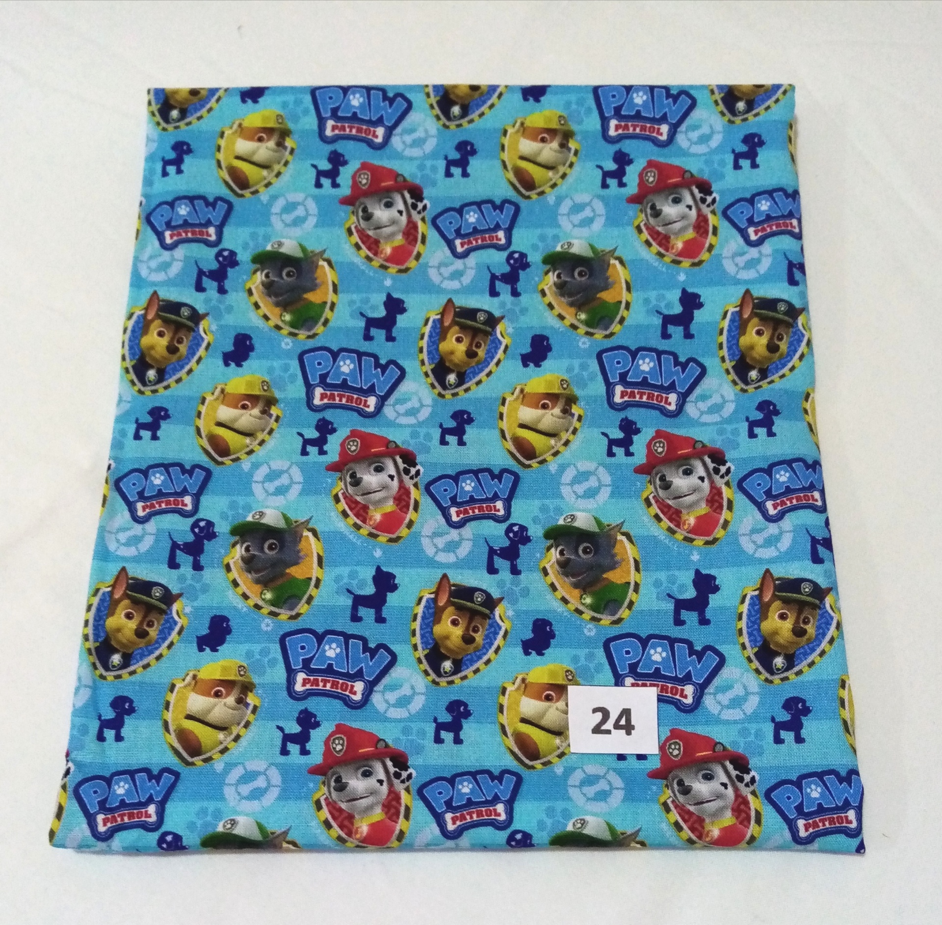 Retalho nº 24 medida: 40x75cm 2,30 € Partilhar Adicionar Contactar 1 unidades em stock Retalho de tecido 100% algodão com a patrulha pata em fundo azul. 20x75cm Tags retalhos