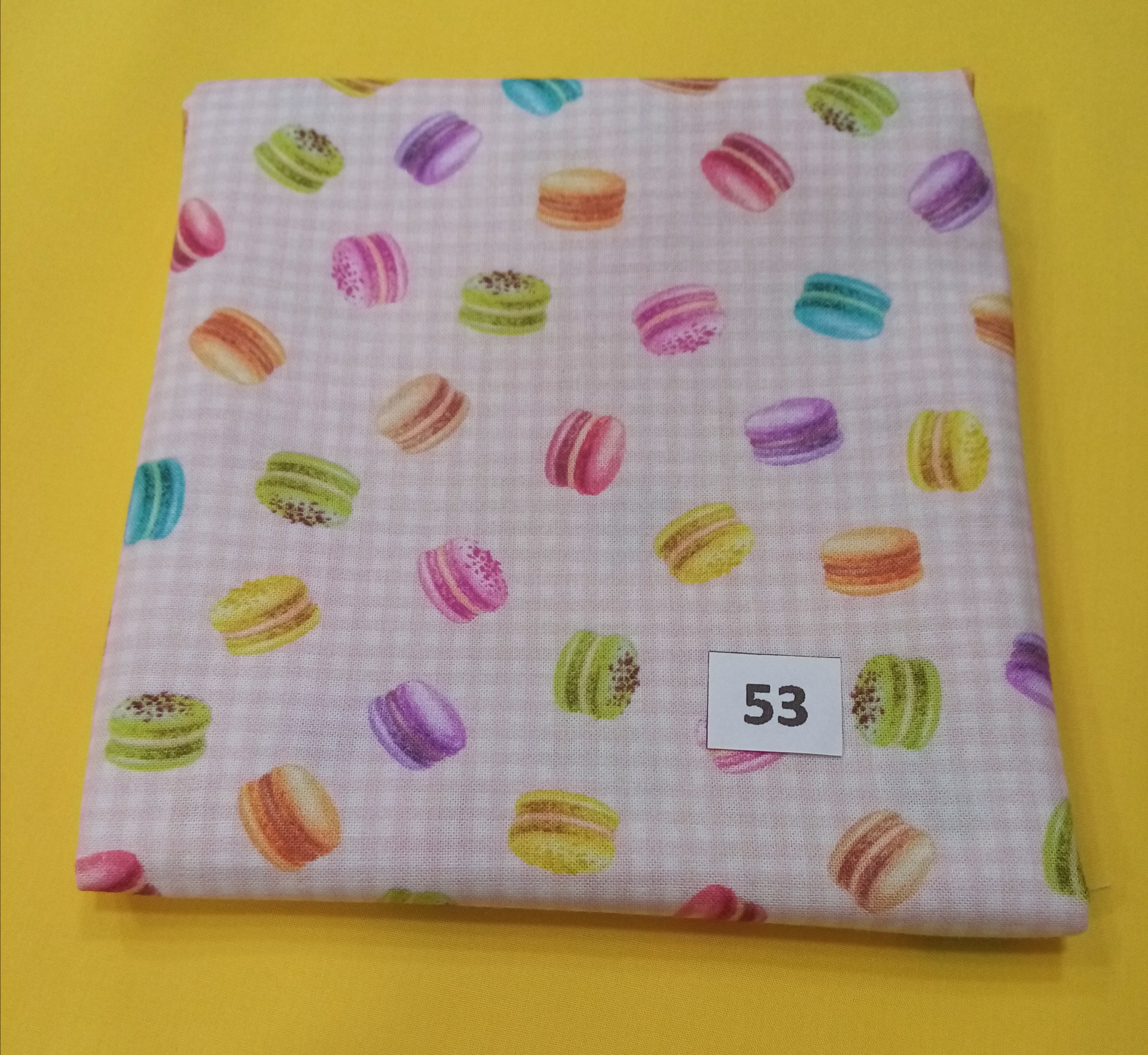 Retalho de tecido 100% algodão Indigo Fabrics, com macarons coloridos em fundo branco e quadradinhos rosa.