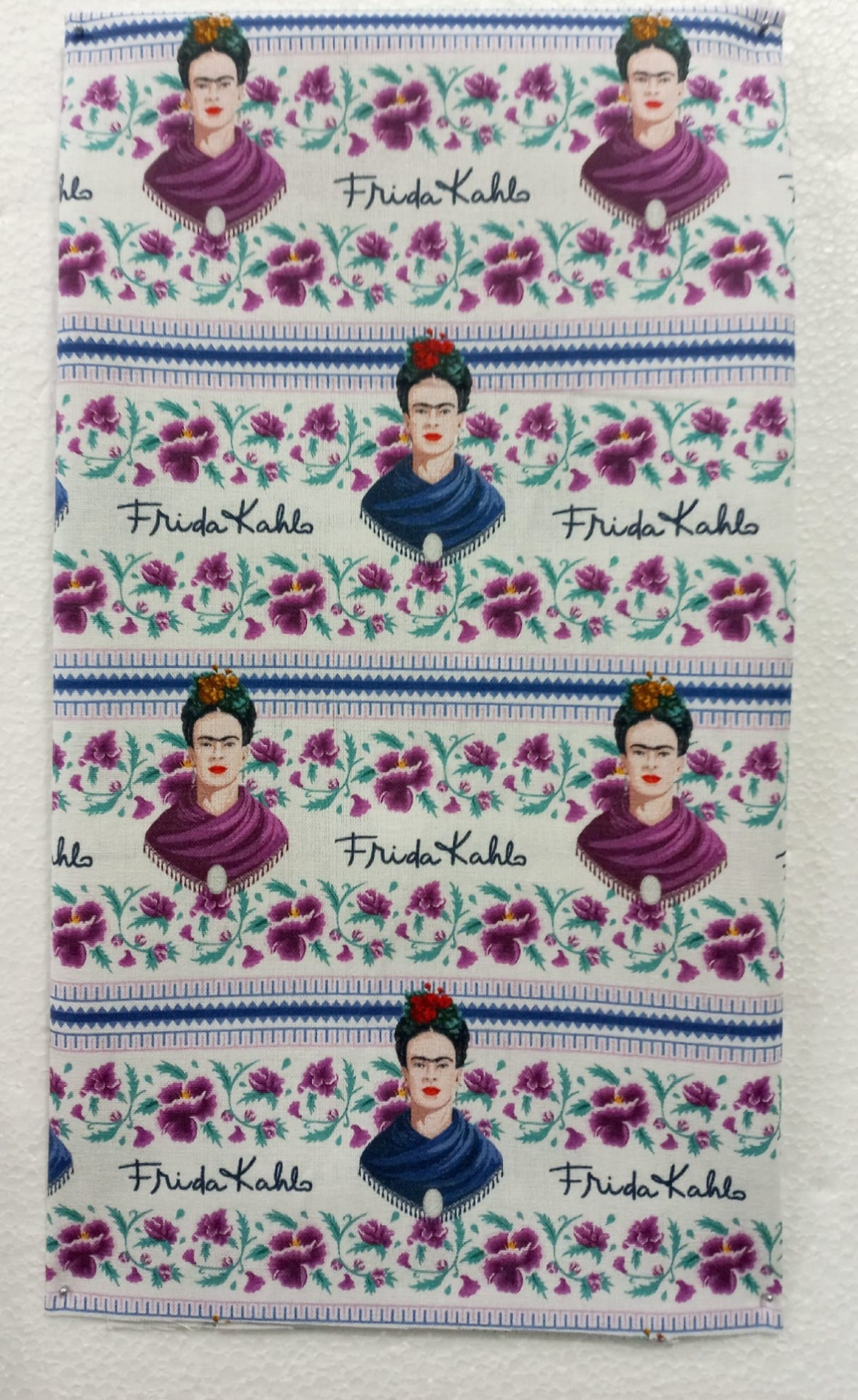 Retalho de tecido 100% algodão, com a Frida Kahlo com flores e riscas em fundo branco.