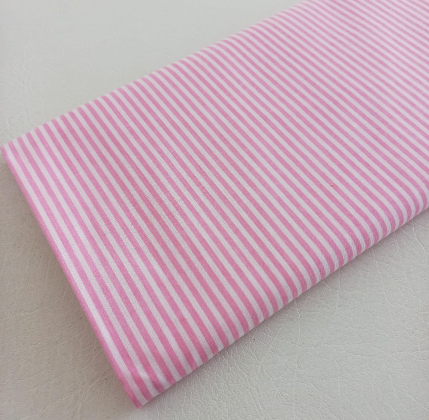 Popeline 100% algodão com riscas rosa e brancas.