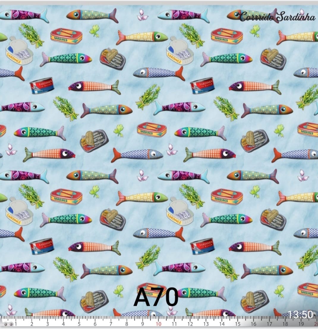Tricoline 100% algodão, com sardinhas coloridas em fundo azul.