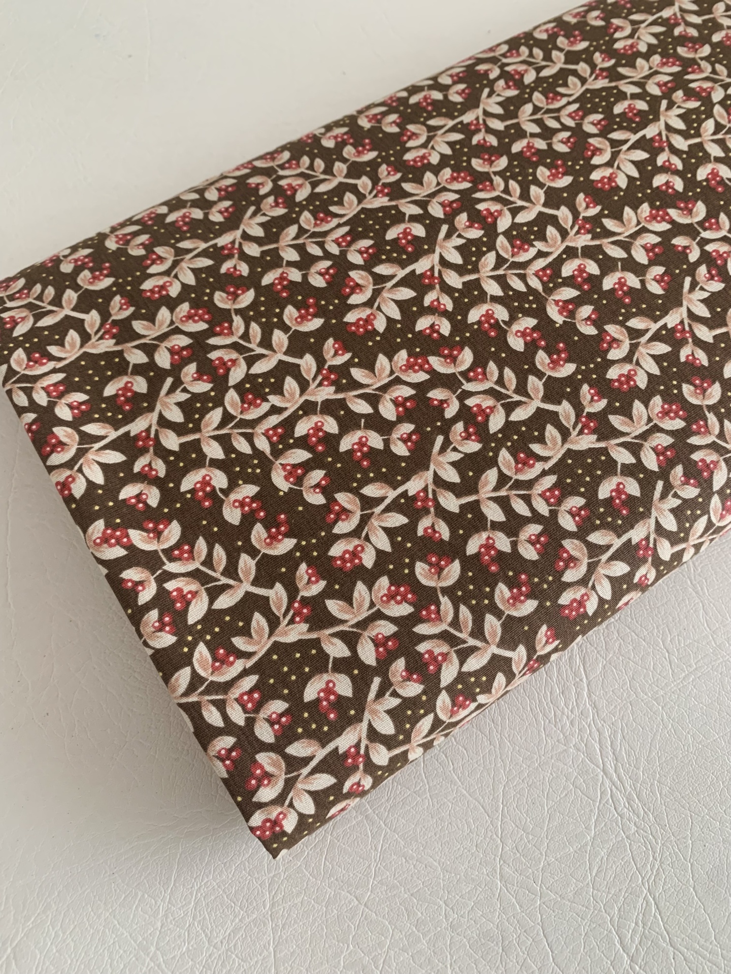 Tecido Fabricart 100% algodão com sementes em bordeaux e em fundo castanho.