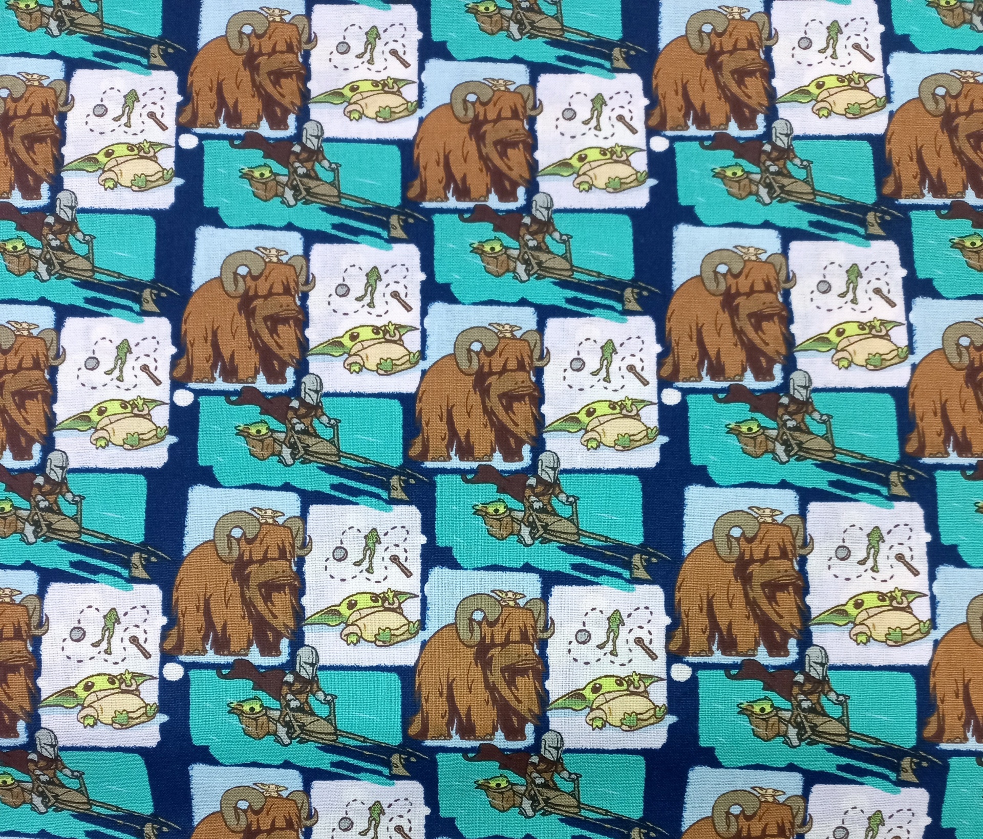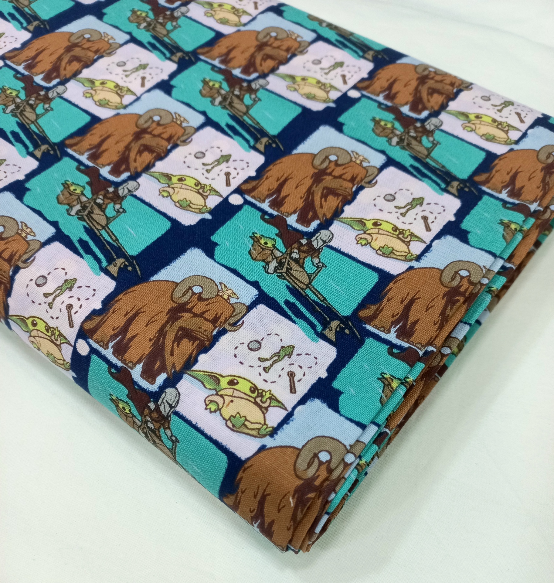 Popeline 100% algodão com motivos da saga Star Wars em fundo azul.