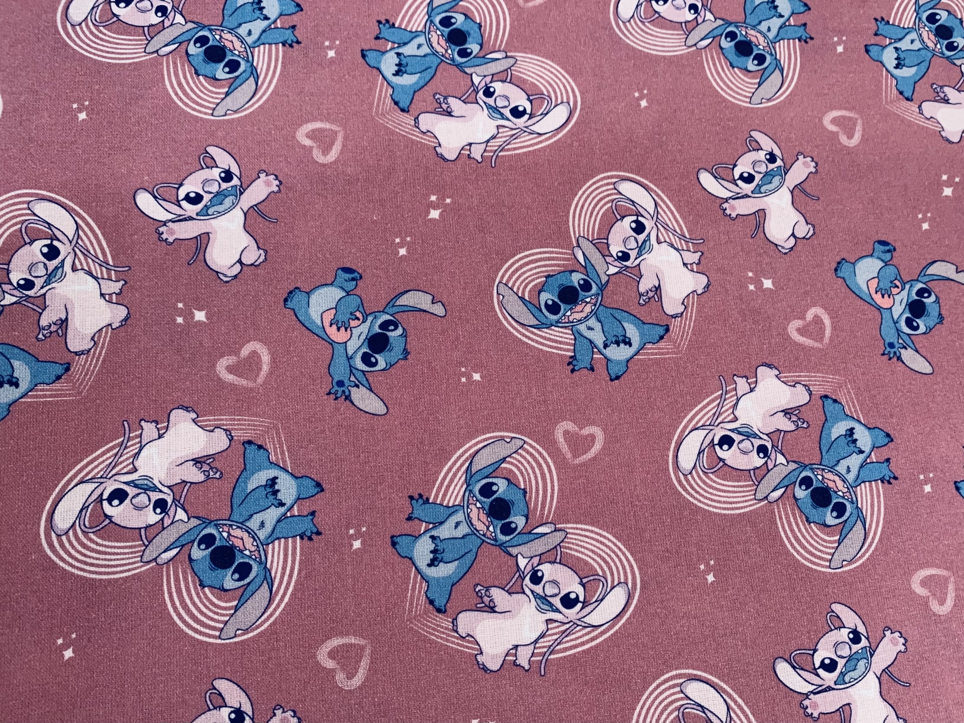 Tricoline 100% algodão com o Stich em fundo rosa velho.