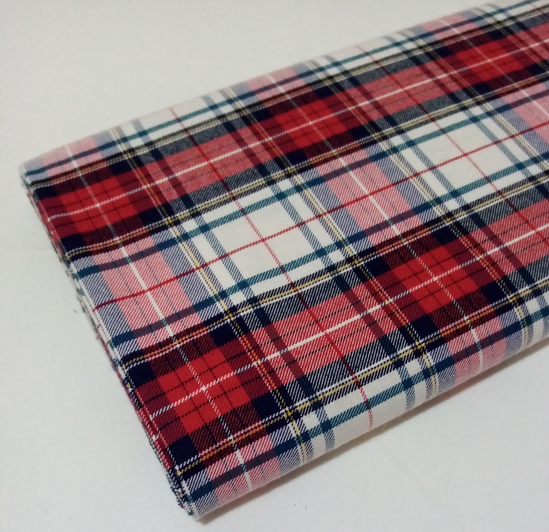 Tartan 100% algodão, com padrão escocês em branco, vermelho e azul.