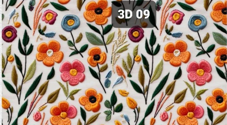 Tricoline 100% algodão com flores coloridas em 3D em fundo bege.