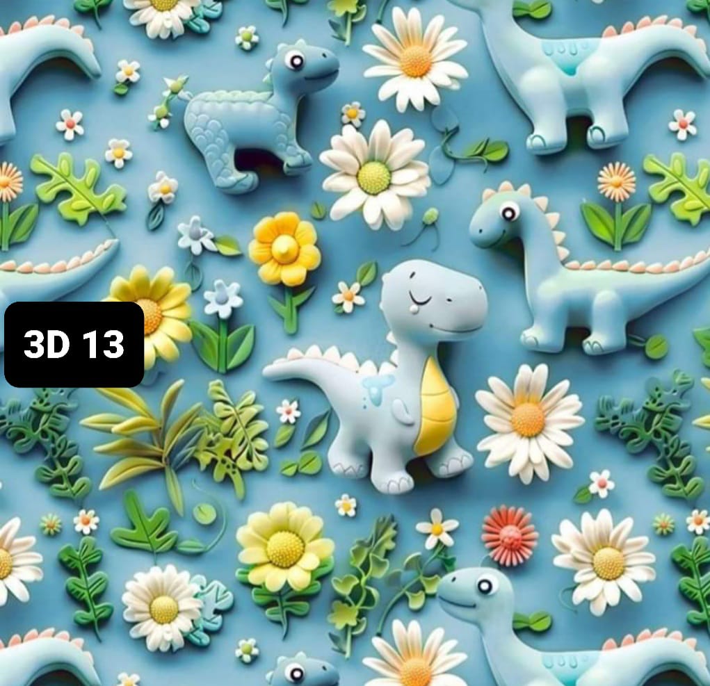 Tricoline 100% algodão com dinossauros em 3D em fundo azul.