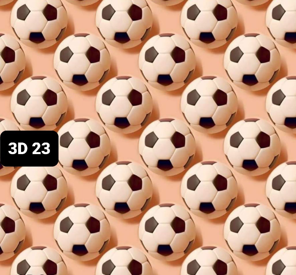 Tricoline 100% algodão com bolas de futebol em 3D em fundo creme.