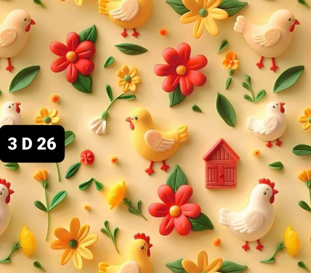 Tricoline 100% algodão com galinhas e pintainhos em 3D em fundo amarelo.