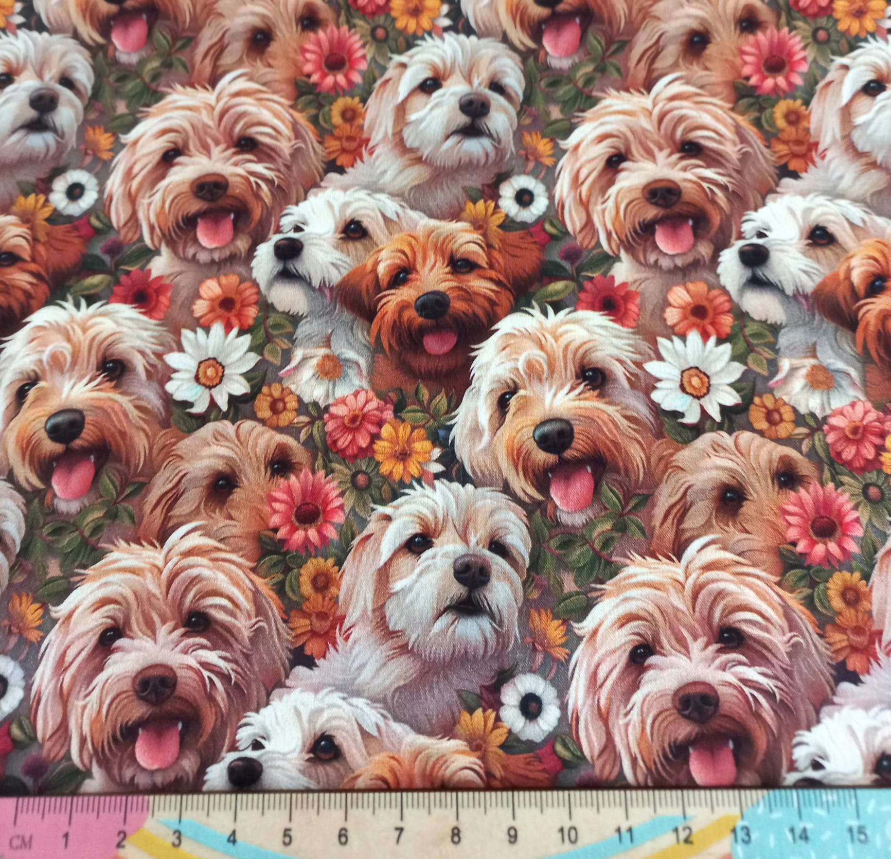 Tricoline 100% algodão, com cães e flores brancas, laranja e salmão em 3D.