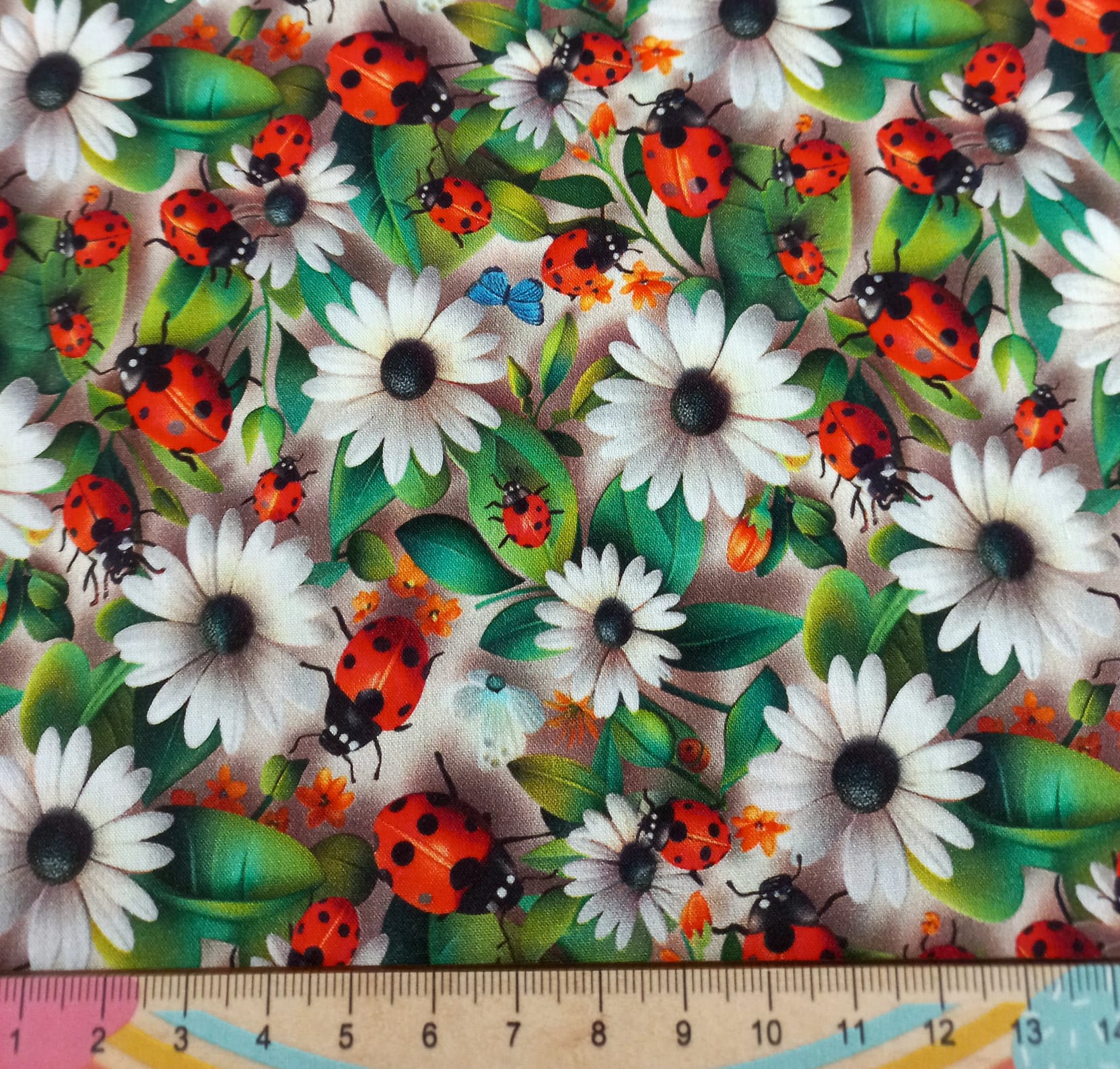 Tricoline 100% algodão, com joaninhas com malmequeres brancos em 3D.
