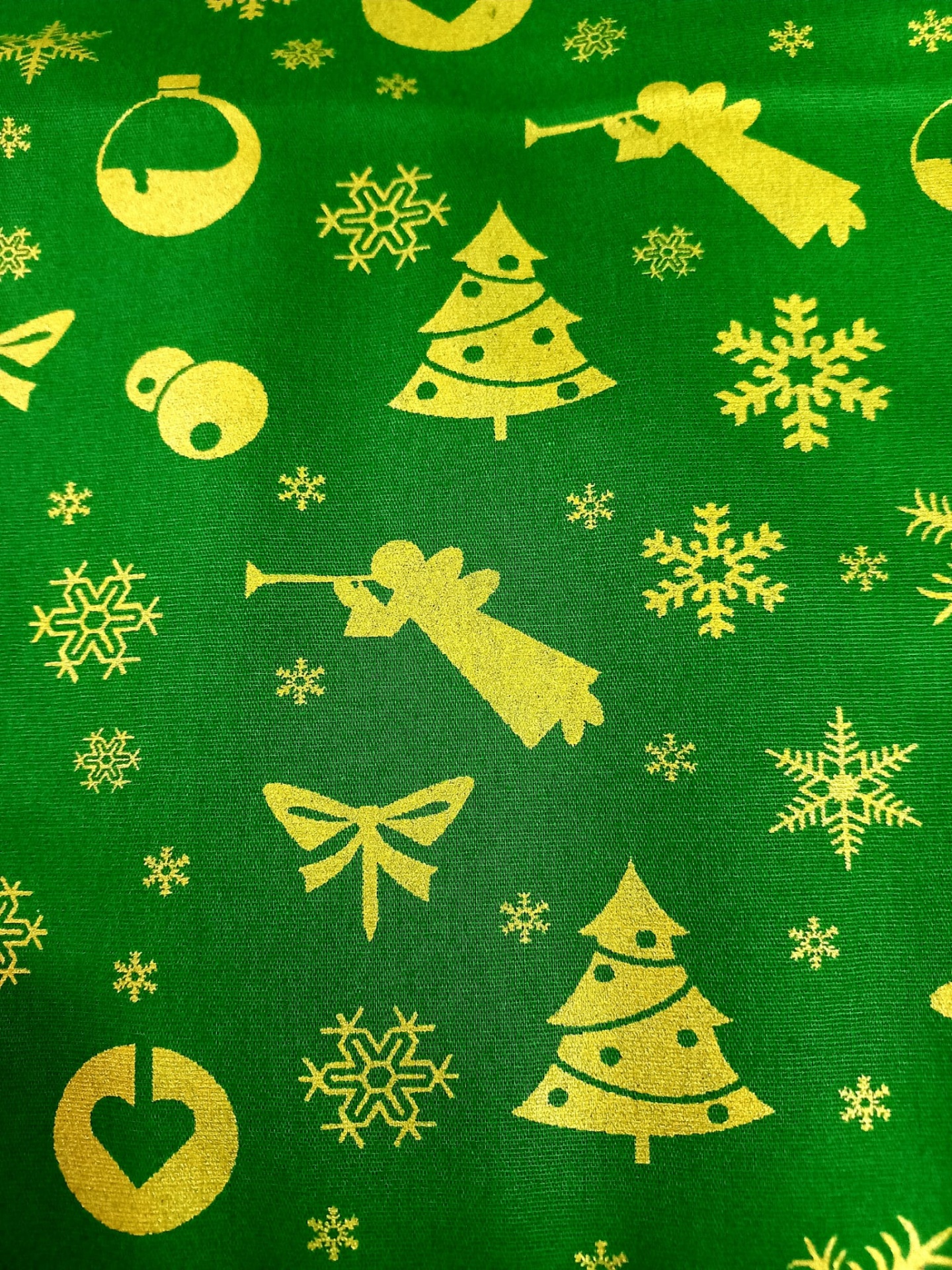 Popeline 100% algodão,com árvores de Natal, Anjos e cristais de gelo dourados em fundo verde.